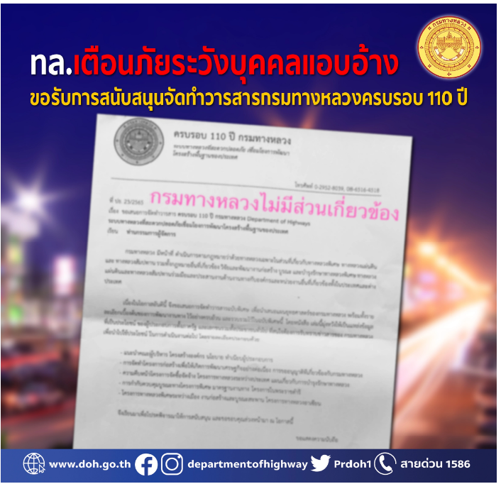 กรมทางหลวง ขอแจ้งเตือนประชาชนให้ระมัดระวังกลุ่มมิจฉาชีพที่แอบอ้างเป็นกรมทางหลวง ดำเนินการส่งหนังสือไปยังผู้ประกอบการต่างๆ เพื่อขอให้ซื้อโฆษณาในวารสารฉบับพิเศษ และเตือนอย่าหลงเชื่อโอนค่าโฆษณาเข้าบัญชีส่วนบุคคลให้กลุ่มมิจฉาชีพดังกล่าว