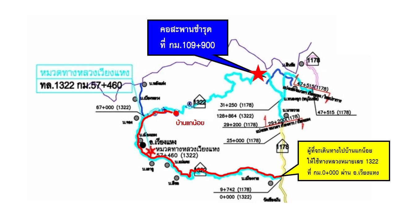 ปิดการจราจรในทางหลวงหมายเลข 1322 ตอน แม่จา-รินหลวง ที่ กม.109+900 พื้นที่ ตำบลเมืองนะ อำเภอเชียงดาว จังหวัดเชียงใหม่ เนื่องจากคอสะพานทรุดตัว
