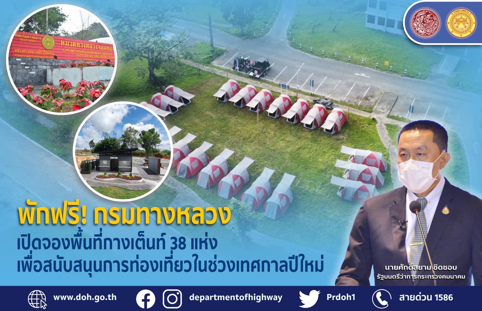 นายสราวุธ ทรงศิวิไล อธิบดีกรมทางหลวง เปิดเผยว่า กรมทางหลวงได้ขานรับนโยบายการเปิดประเทศตั้งแต่วันที่ 1 พ.ย. 64 ที่ผ่านมา ของนายศักดิ์สยาม ชิดชอบ รัฐมนตรีว่าการกระทรวงคมนาคม ในการสนับสนุนการท่องเที่ยวภายในประเทศทำให้มีประชาชนเดินทางไปท่องเที่ยวพักผ่อนรับลมหนาวโดยเฉพาะทางภาคเหนือและจังหวัดท่องเที่ยวเป็นจำนวนมาก กรมทางหลวงจึงได้จัดเตรียมจุดบริการกางเต็นท์ทั่วประเทศ จำนวน 38 แห่ง แบ่งเป็นภาคเหนือ 30 แห่ง ภาคตะวันออกเฉียงเหนือ 3 แห่ง ภาคตะวันตก 3 แห่ง ภาคกลาง 2 แห่ง เพื่ออำนวยความสะดวกและรองรับการท่องเที่ยวของประชาชน โดยพื้นที่กางเต็นท์แต่ละแห่งจะตั้งอยู่ในพื้นที่ความรับผิดชอบของหมวดทางหลวงซึ่งจะมีเจ้าหน้าที่คอยอำนวยความสะดวกและให้บริการประชาชนตลอด 24 ชั่วโมง พร้อมบริการน้ำดื่ม ห้องสุขา และสอบถามข้อมูลทางหลวง