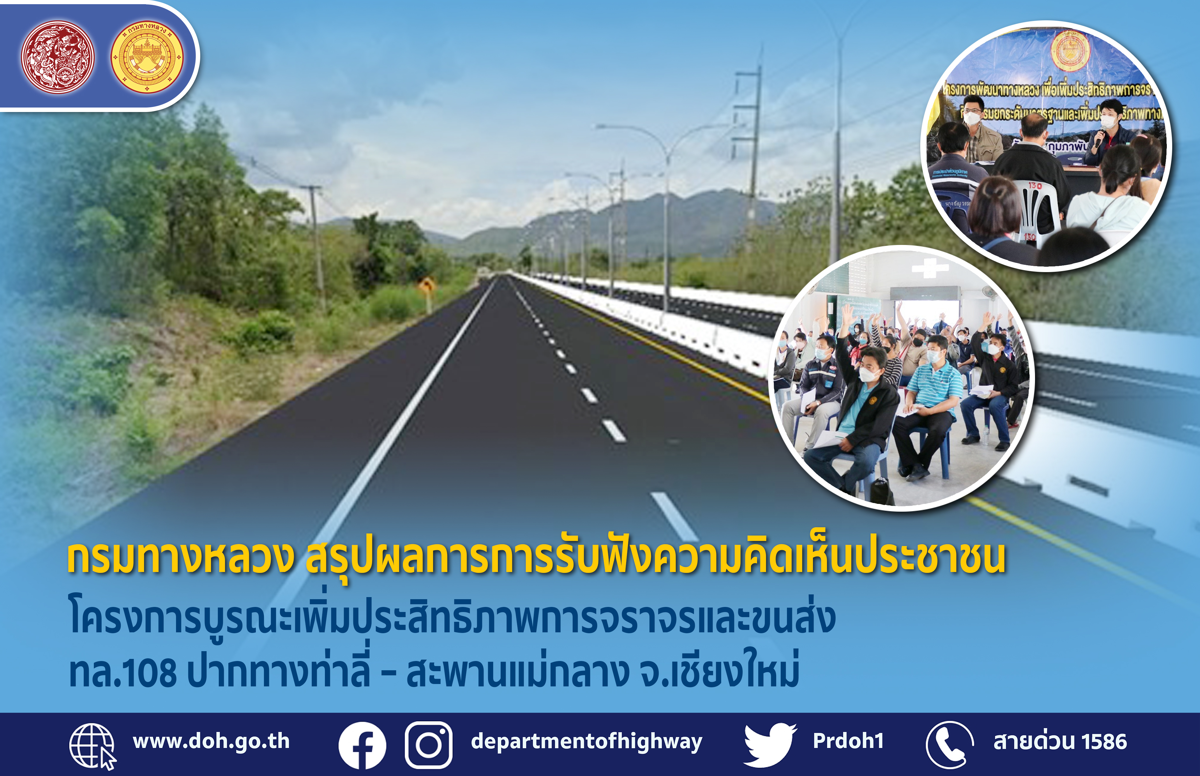 กรมทางหลวง โดยแขวงทางหลวงเชียงใหม่ที่ 1 สำนักงานทางหลวงที่ 1 (เชียงใหม่) ได้ดำเนินโครงการการมีส่วนร่วมและแสดงความคิดเห็นของประชาชน โครงการพัฒนาทางหลวงเพื่อเพิ่มประสิทธิภาพการจราจรและขนส่ง กิจกรรมยกระดับมาตรฐานและเพิ่มประสิทธิภาพทางหลวง ในทางหลวงหมายเลข 108 ตอน ปากทางท่าลี่ – สะพานแม่กลาง ระหว่าง กม.80 – 81+600 ระยะทางประมาณ 1.6 กิโลเมตร ในพื้นที่ตำบลสบเตี๊ยะ อำเภอจอมทอง จังหวัดเชียงใหม่ เมื่อวันพุธที่ 2 กุมภาพันธ์ 2565 ณ ห้องประชุมประจำหมู่บ้าน บ้านนากบ ตำบลบ้านแปะ อำเภอจอมทอง จังหวัดเชียงใหม่ เพื่อเพิ่มความปลอดภัยและส่งเสริมให้ประชาชนมีบทบาทและมีส่วนร่วมในการดำเนินงานโครงการต่างๆ ของกรมทางหลวง