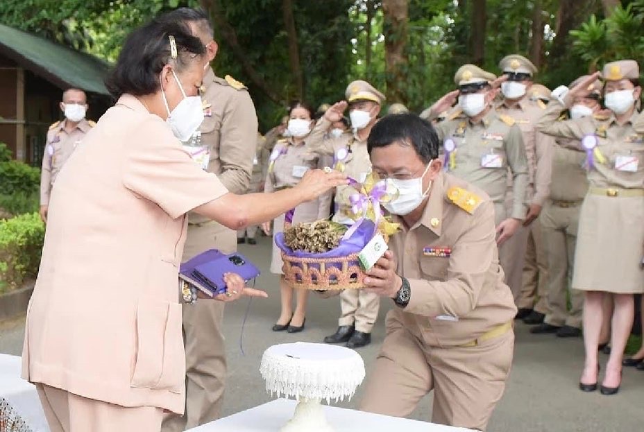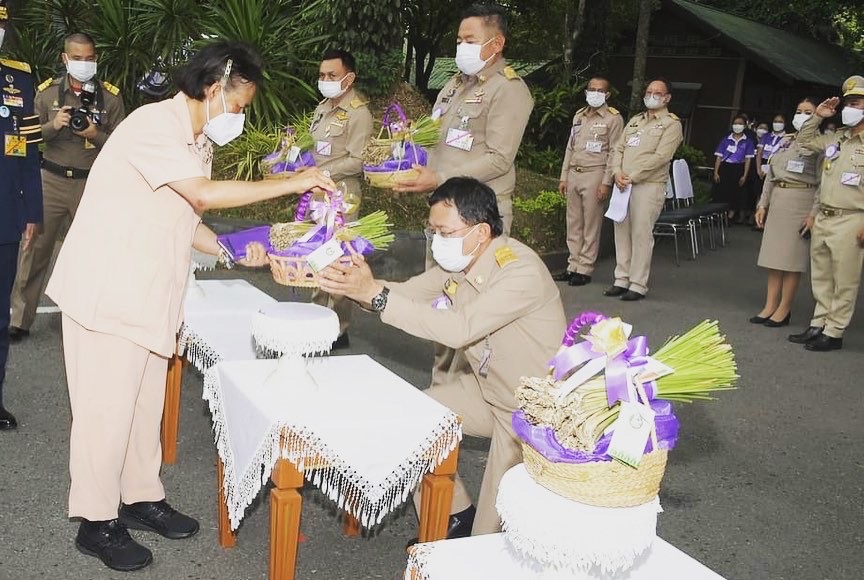 จากนั้น เสด็จไปยังลานหน้าอาคารอำนวยการ พระราชทานพระราชวโรกาสให้ ผู้แทนกรมพัฒนาที่ดิน, กรมชลประทาน, กรมทางหลวง, โครงการพัฒนาพื้นที่ป่าขุนแม่กวงอันเนื่องมาจากพระราชดำริ, โครงการพัฒนาพื้นที่ห้วยลานอันเนื่องมาจากพระราชดำริ, เครือข่ายคนรักษ์แฝก และกลุ่มแฝกหลวง บ้านซาง อำเภอแม่ริม เฝ้าทูลละอองพระบาท รับพระราชทานกล้าหญ้าแฝก ในการนี้ นายสราวุธ ทรงศรีวิไล อธิบดีกรมทางหลวง เป็นผู้รับพระราชทานกล้าหญ้าแฝกดอน สายพันธ์ุปางกว้าง จำนวน 69 กล้า เพื่อนำไปใช้ประโยชน์ในด้านต่างๆและคืนความอุดมสมบูรณ์ของผืนแผ่นดินต่อไป