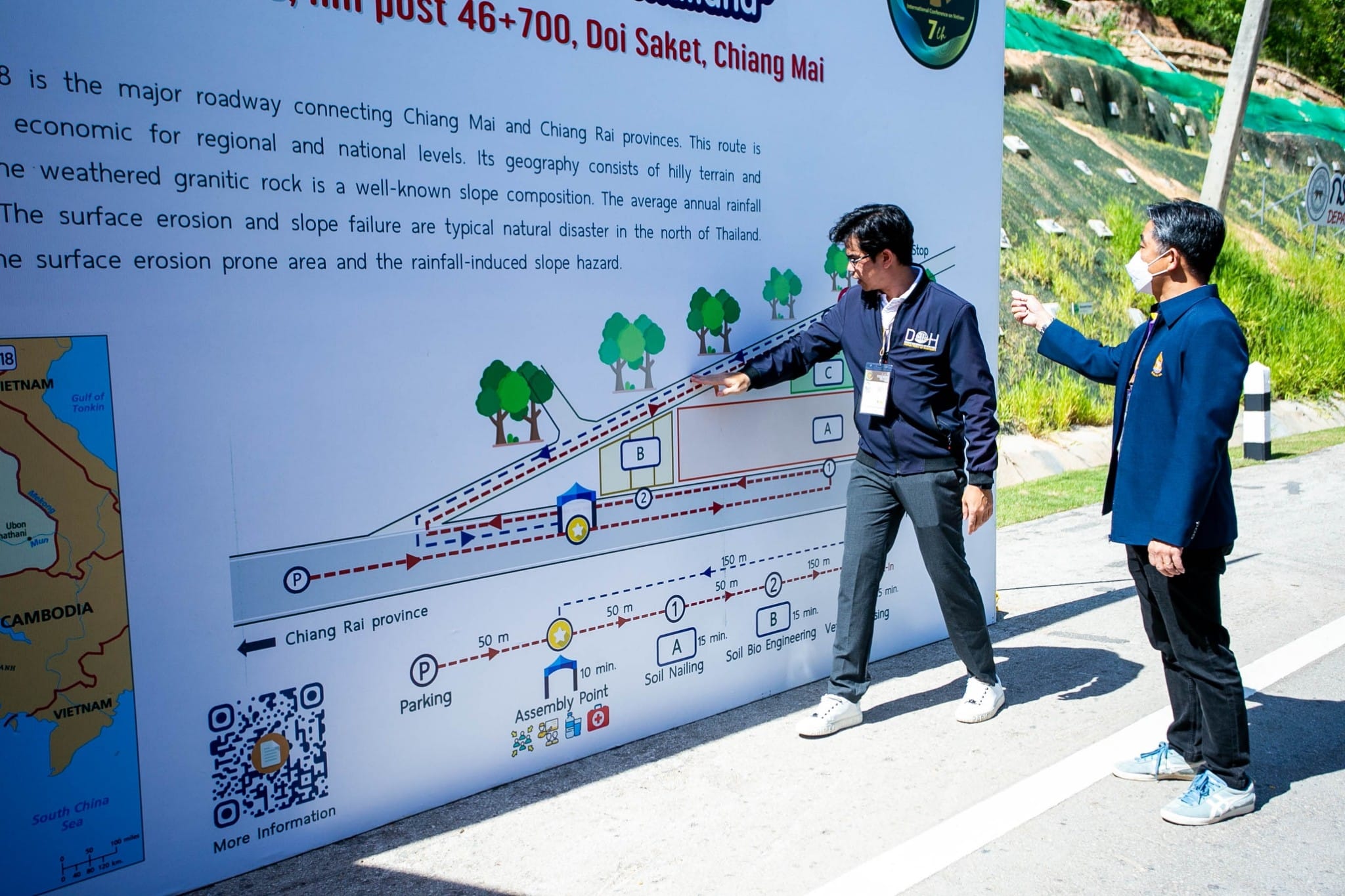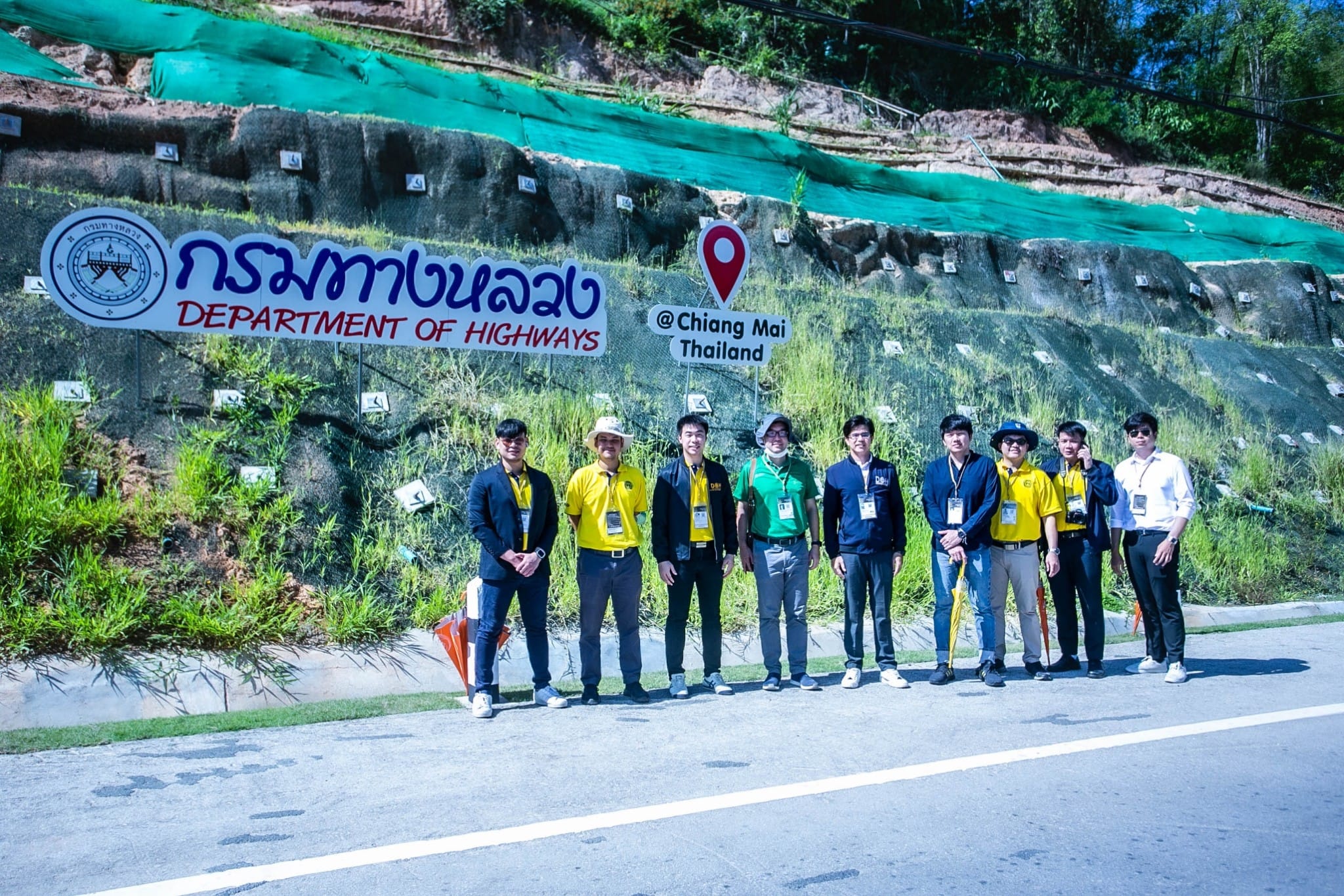 นายวรศักดิ์ วงษ์รอด วิศวกรโยธาเชี่ยวชาญ รักษาราชการแทน ผู้อำนวยการสำนักงานทางหลวงที่ 1 พร้อมด้วย นายนิคม เทพบุตร ผู้อำนวยการแขวงทางหลวงเชียงใหม่ที่ 2 และเจ้าหน้าที่ในสังกัด ให้การต้อนรับ คณะผู้เชี่ยวชาญจากสำนักวิจัยและพัฒนางานทาง และผู้เข้าร่วมการประชุมหญ้าแฝกนานาชาติ ครั้งที่ 7 เยี่ยมชมโครงการศึกษาเทคโนโลยีตรวจวัด ติดตาม เตือนภัย และบริหารจัดการความเสี่ยงภัยพิบัติดินสไลด์ในโครงข่ายทางหลวง ทล.118 บริเวณที่ กม.46+700 (แปลงศึกษา) อ.ดอยสะเก็ด จ.เชียงใหม่
