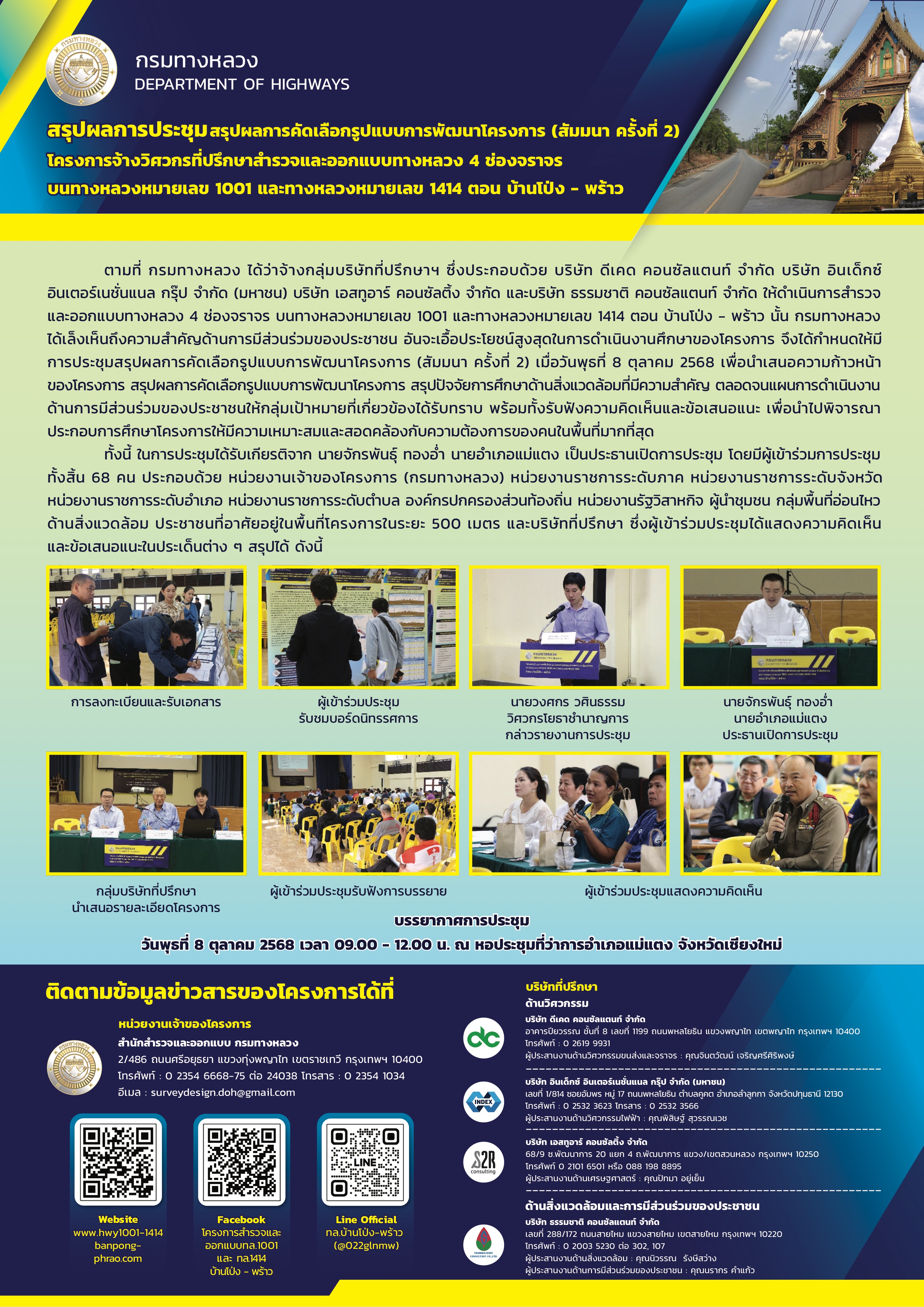 กรมทางหลวง สรุปผลการประชุม “สรุปผลการคัดเลือกรูปแบบการพัฒนาโครงการ (สัมมนา ครั้งที่ 2) โครงการ จ้างวิศวกรที่ปรึกษาสำรวจและออกแบบทางหลวง 4 ช่องจราจร บนทางหลวงหมายเลข 1001 และ 1414 ตอน บ้านโป่ง – พร้าว”