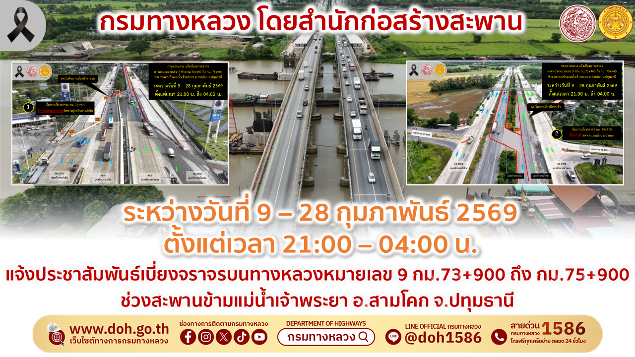 กรมทางหลวง โดยสำนักก่อสร้างสะพาน ขอแจ้งประชาสัมพันธ์ เบี่ยงจราจรบนทางหลวงหมายเลข 9 กม.73+900 ถึง กม.75+900 ช่วงสะพานข้ามแม่น้ำเจ้าพระยา อ.สามโคก จ.ปทุมธานี เพื่อเตรียมการติดตั้งโครงสร้างชั่วคราวสำหรับงานก่อสร้างสะพานข้ามแม่น้ำเจ้าพระยา
