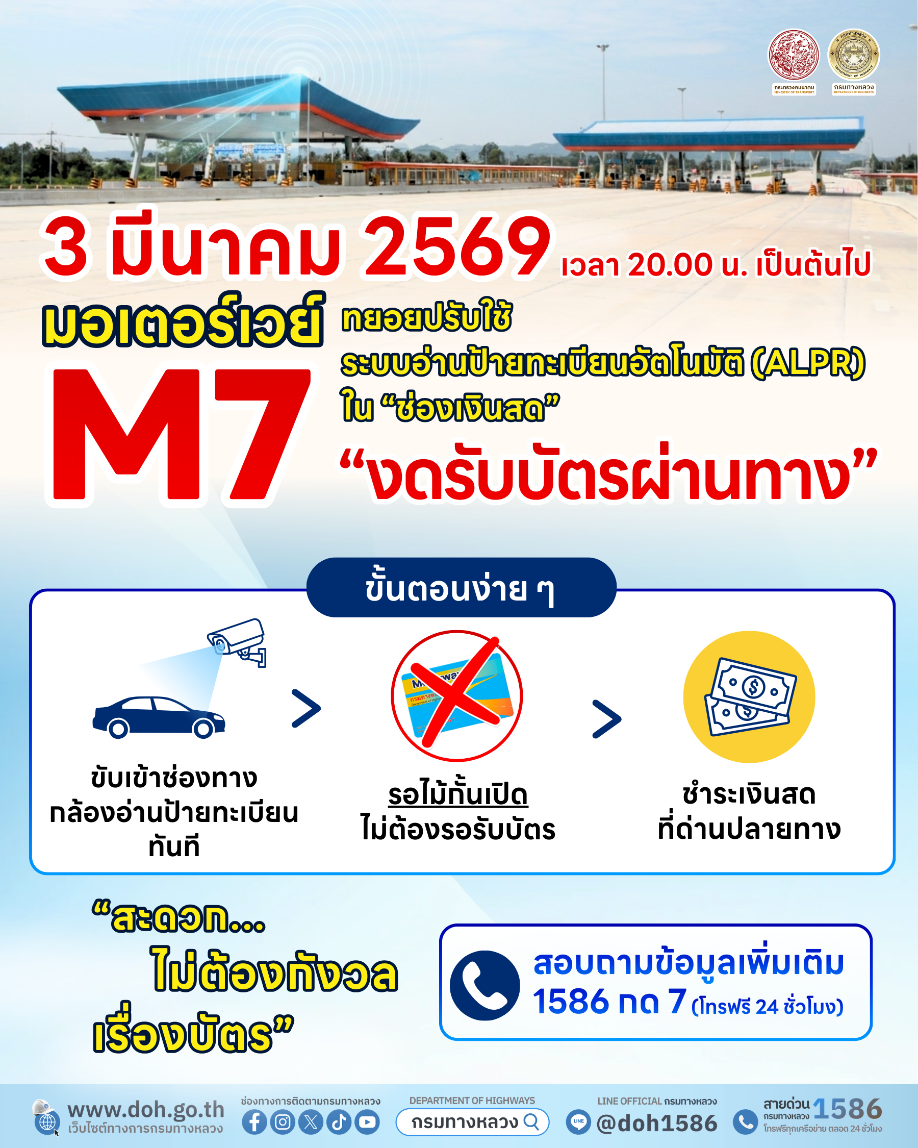 กรมทางหลวง ดีเดย์ 3 มี.ค. นี้! มอเตอร์เวย์ M7 นำร่องระบบ ALPR ช่องเงินสด “ขับผ่านฉลุย ไม่ต้องหยุดรับบัตร"