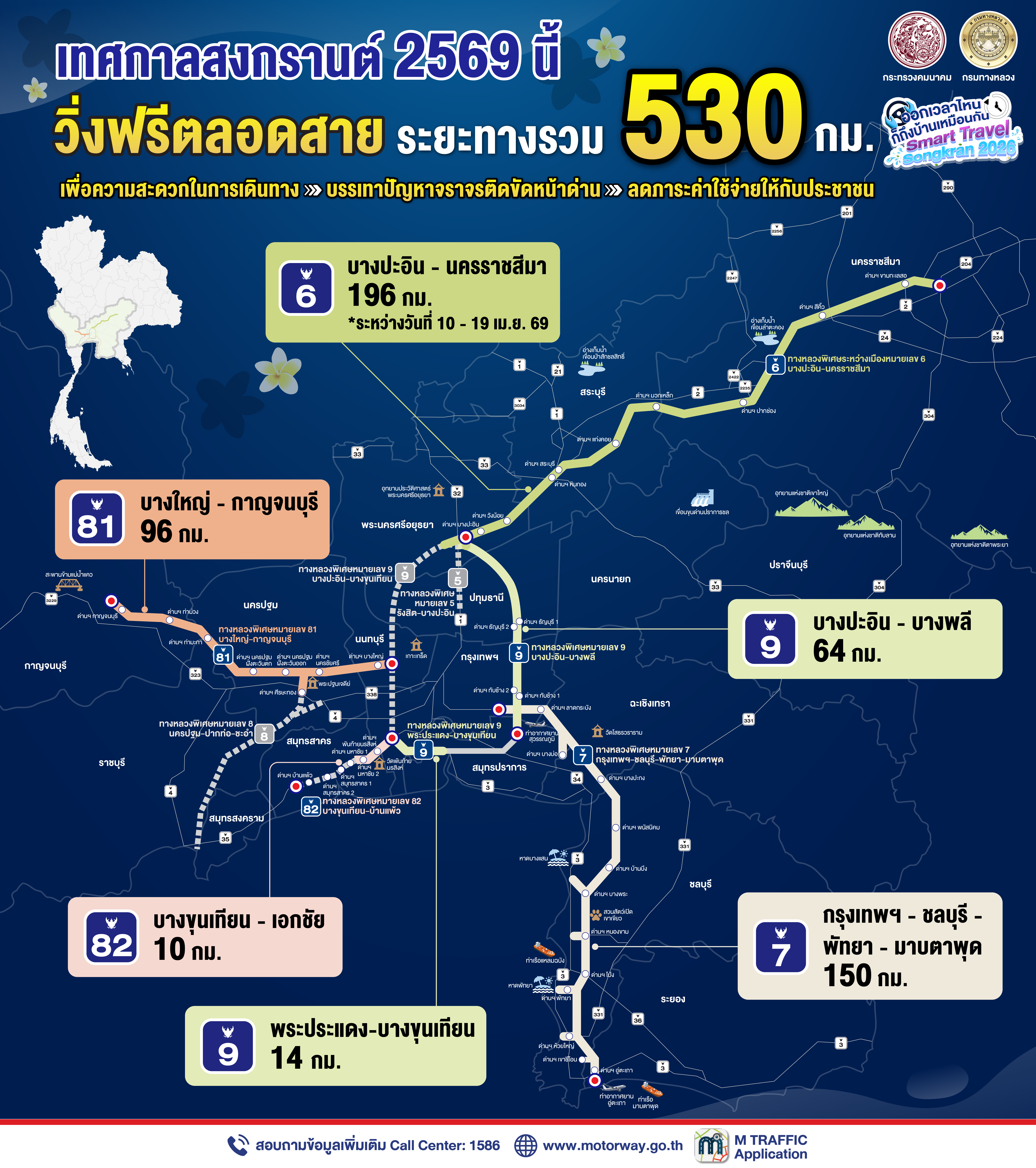 15 03/04/2569 กรมทางหลวงมอบของขวัญสงกรานต์ วิ่งฟรีมอเตอร์เวย์ 5 สาย (M7-M9-M81-M6-M82) 7 วัน รวมระยะทาง 530 กม. เริ่ม10 เม.ย. นี้