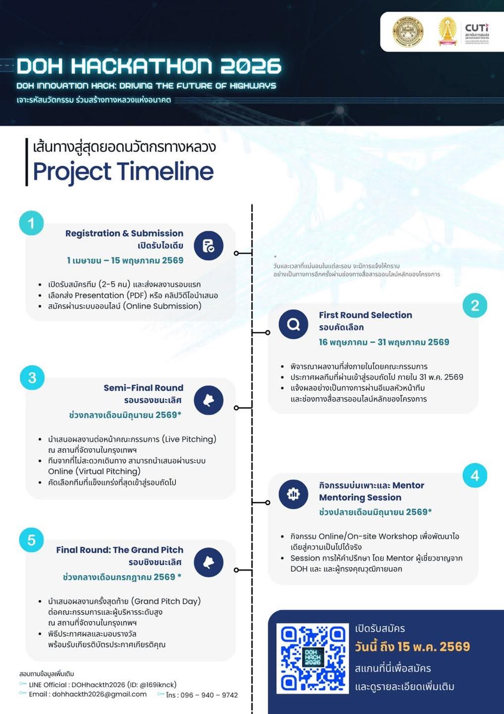 14 03/04/2569 พลิกโฉมทางหลวงไทยด้วยไอเดียของคุณ! กรมทางหลวง (DOH) ผนึกกำลัง สถาบันการขนส่ง จุฬาฯ (CUTI) ขอเชิญผู้สนใจร่วมแข่งขัน DOH HACKATHON 2026: Driving the Future of Highways