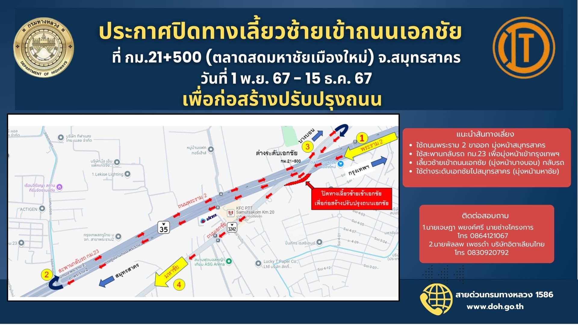 ประกาศปิดทางเลี้ยวซ้ายเข้าถนนเอกชัย ที่ กม.21+500 บริเวณ ตลาดสดมหาชัยเมืองใหม่