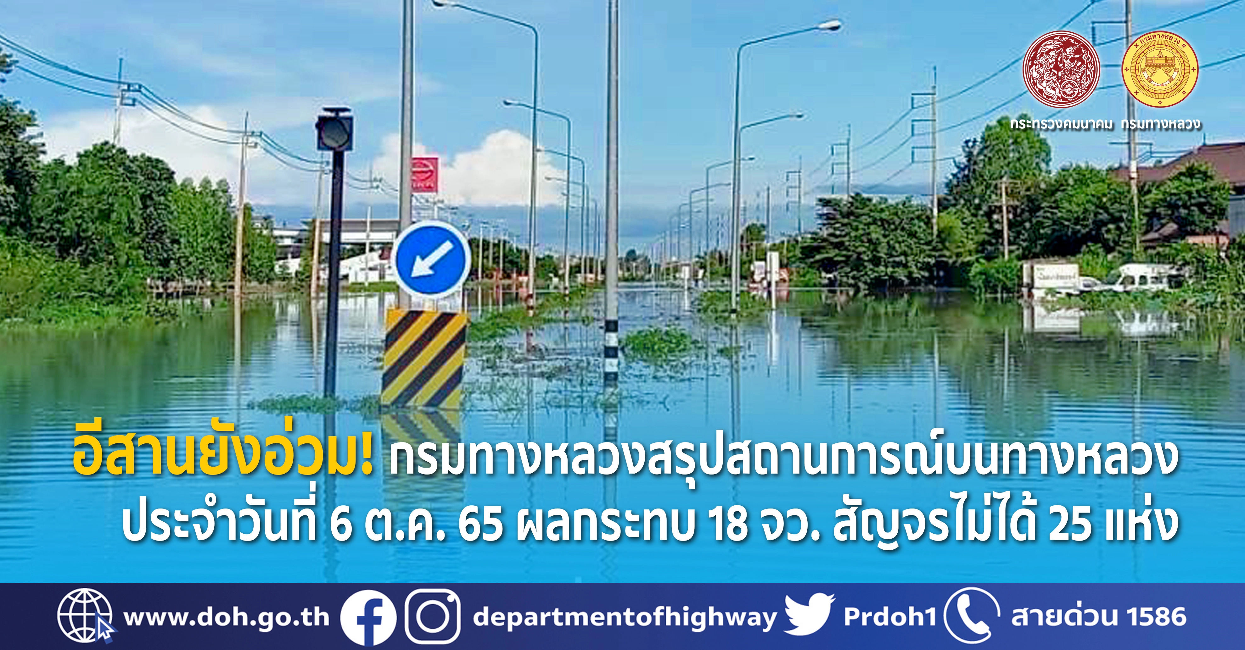 อีสานยังอ่วม! กรมทางหลวงสรุปสถานการณ์น้ำท่วมบนทางหลวง ประจำวันที่ 6 ต.ค. 65 ผลกระทบ 18 จว. สัญจรไม่ได้ 25 แห่ง