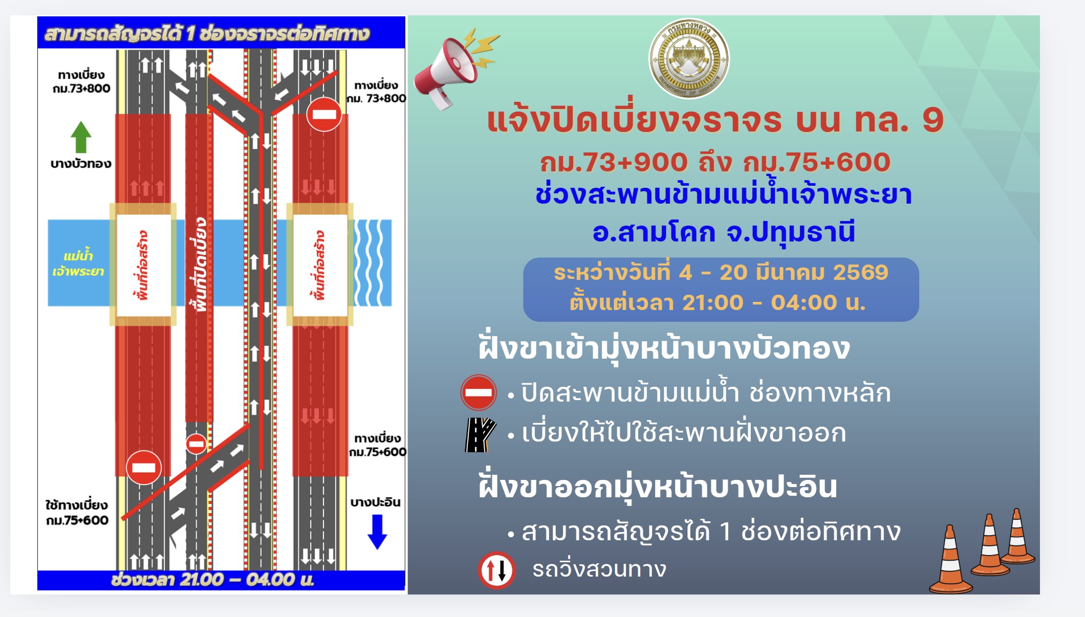 กรมทางหลวง โดยสำนักก่อสร้างสะพาน ขอแจ้งประชาสัมพันธ์ เบี่ยงจราจรบนทางหลวงหมายเลข 9 กม.73+900 ถึง กม.75+900 ช่วงสะพานข้ามแม่น้ำเจ้าพระยา อ.สามโคก จ.ปทุมธานี เพื่อเตรียมการติดตั้งโครงสร้างชั่วคราวสำหรับงานก่อสร้างสะพานข้ามแม่น้ำเจ้าพระยา