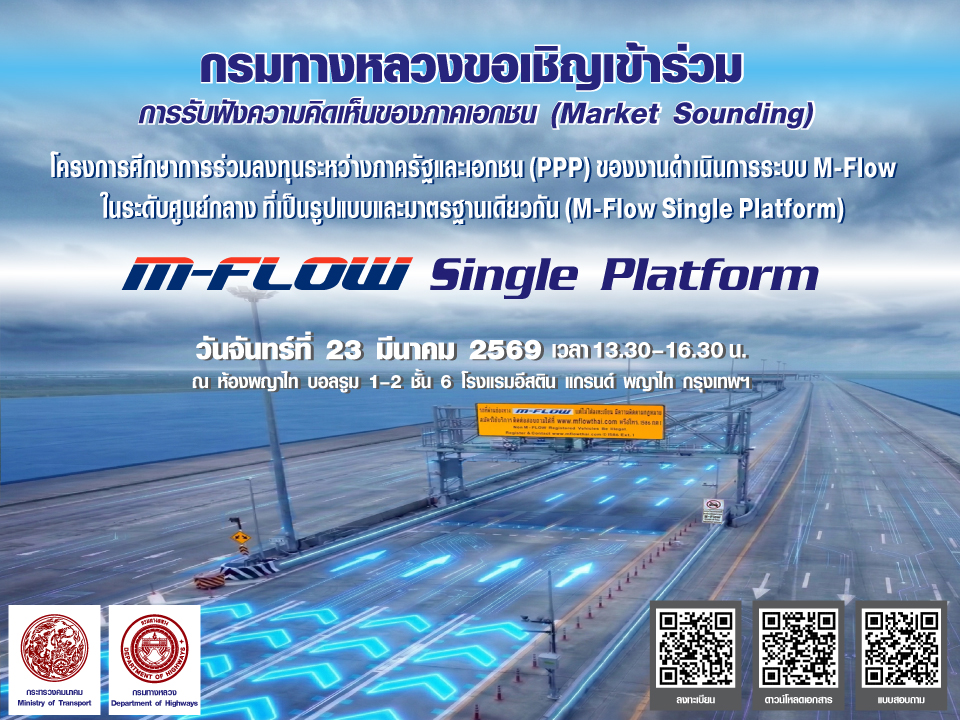 กรมทางหลวงจะดำเนินการเปิดรับฟังความคิดเห็นจากภาคเอกชน (Market Sounding) สำหรับการให้เอกชนร่วมลงทุนในโครงการงานดำเนินการระบบ M-Flow ในระดับศูนย์กลาง ซึ่งมีรูปแบบและมาตรฐานเดียวกัน (M-Flow Single Platform)