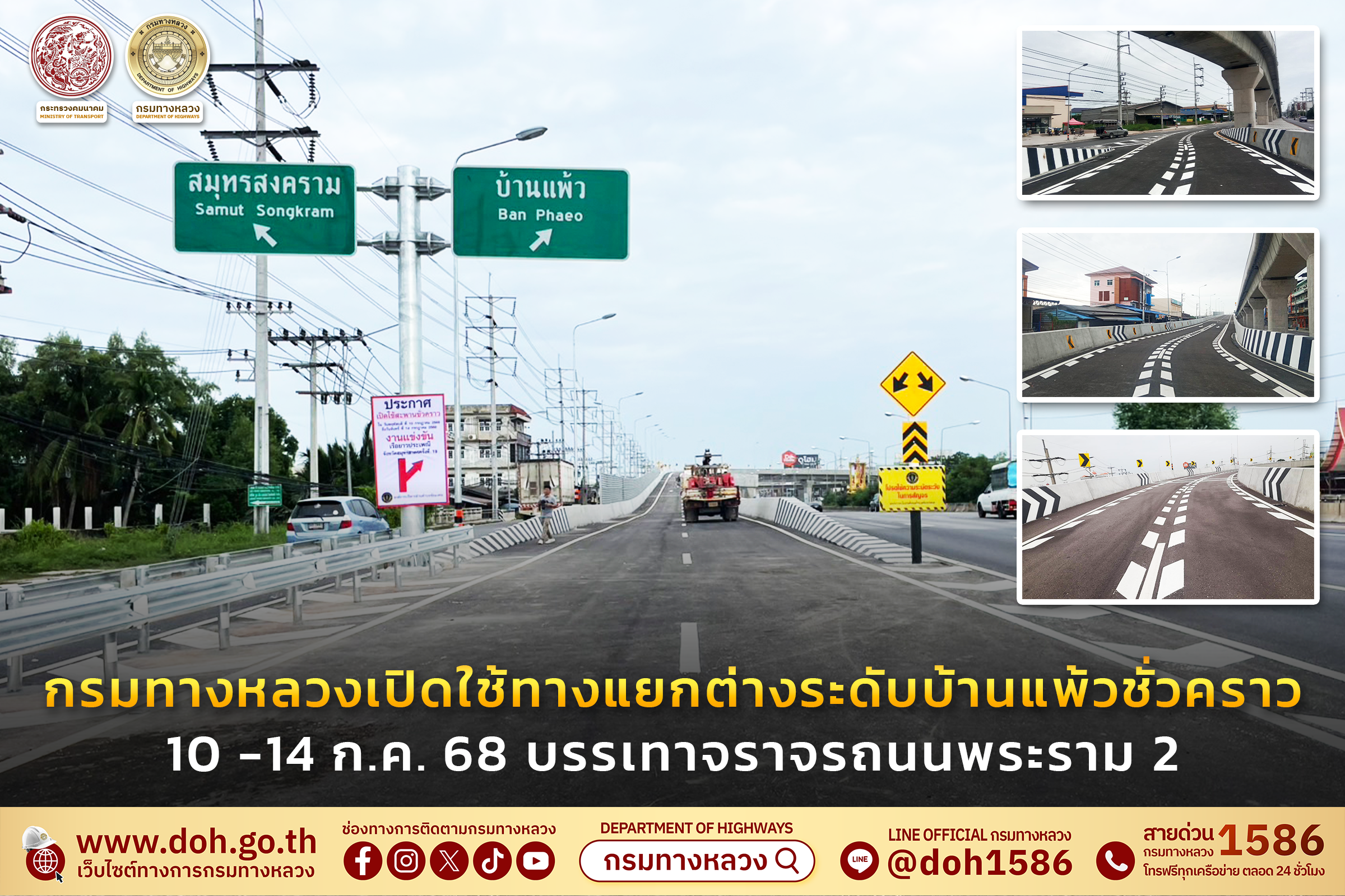 กรมทางหลวงเปิดใช้ทางแยกต่างระดับบ้านแพ้วชั่วคราว 10 -14 ก.ค. 68 เพิ่มความสะดวกการจราจรถนนพระราม 2