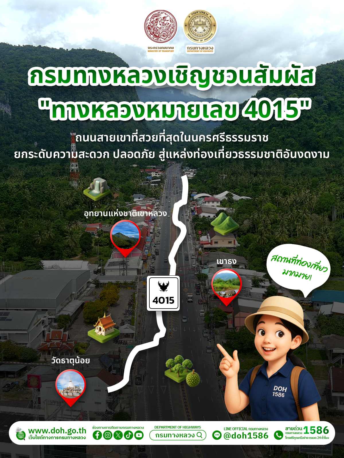 กรมทางหลวงเชิญชวนสัมผัส "ทางหลวงหมายเลข 4015" ถนนสายเขาที่สวยที่สุดในนครศรีธรรมราชยกระดับความสะดวก ปลอดภัย สู่แหล่งท่องเที่ยวธรรมชาติอันงดงาม