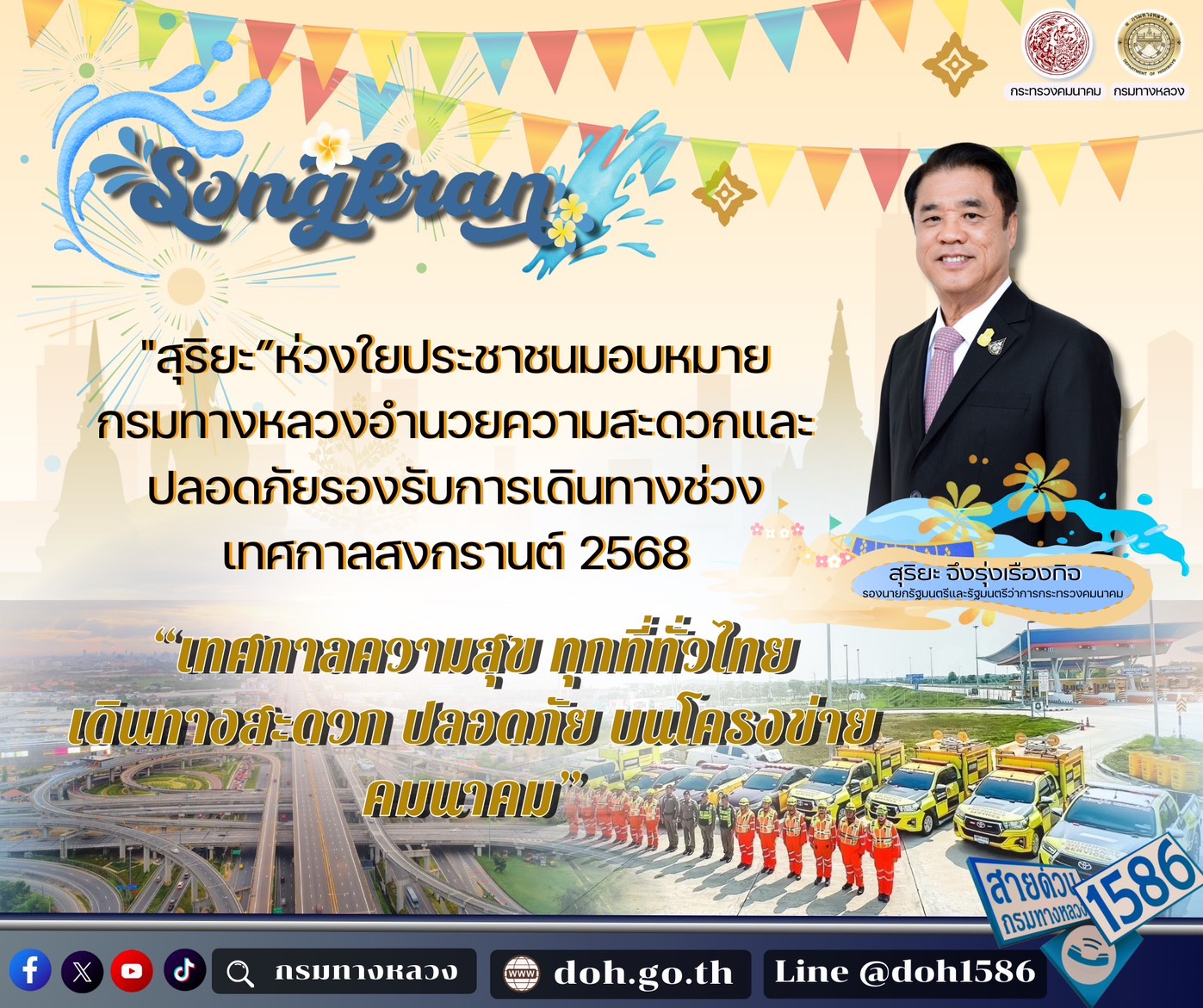 “สุริยะ” ห่วงใยประชาชน กำชับทางหลวงดูแลอำนวยความสะดวกประชาชนช่วงสงกรานต์ 68 “อธิบดีทางหลวง” รับลูกสั่งหน่วยงานในพื้นที่ดูแลถนนให้พร้อมใช้งาน - คืนผิวจราจรทุกโครงการ พร้อมตั้งจุดบริการ 423 แห่ง - เปิดมอเตอร์เวย์ให้วิ่งฟรี