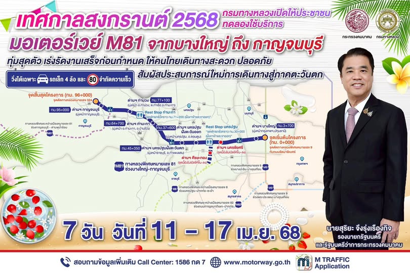 ฟรี 7 วัน! กรมทางหลวง เปิดฟรีมอเตอร์เวย์ระหว่างวันที่ 11 – 17 เม.ย. 68 เพื่ออำนวยความสะดวกในการเดินทางแก่ประชาชนช่วงเทศกาลสงกรานต์ 2568
