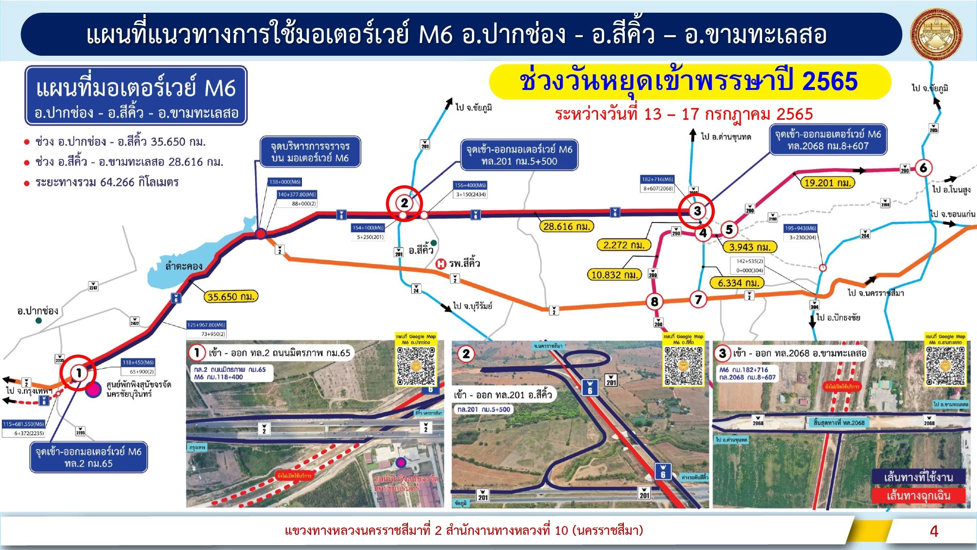 สำหรับการบริหารการจราจรมอเตอร์เวย์ M6 ช่วง ปากช่อง - สีคิ้ว - ขามทะเลสอ ช่วงขาออกวันที่ 13 – 14 กรกฎาคม 2565 และขาเข้าวันที่ 15 – 17 กรกฎาคม 2565 มีรูปแบบการให้บริการเดินรถทางเดียว โดยจะเปิดช่องจราจรด้านขวาทาง (ด้านขาเข้า) จำนวน 2 ช่องจราจรเท่านั้น สำหรับช่องจราจรด้านซ้ายทาง (ด้านขาออก) จะสงวนไว้ใช้สำหรับบริการฉุกเฉินเฉพาะเจ้าหน้าที่เท่านั้น โดยเปิดให้บริการมีจุดเข้า - ออกตามแผนที่ดังนี้