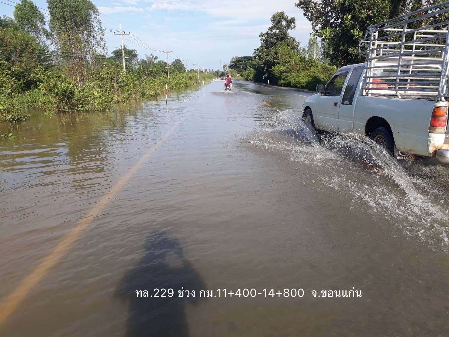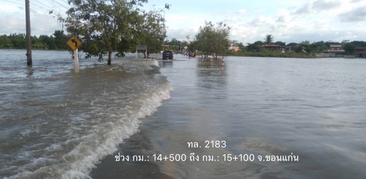 - ทางหลวงหมายเลข 2183 น้ำพอง – โคกท่า ในพื้นที่ อ.น้ำพอง ช่วง กม.ที่ 14+500 – 15+100 ระดับน้ำ 40 - 45 ซม. การจราจรไม่สามารถผ่านได้ ให้ใช้เส้นทางเลี่ยงแยกโคกท่า กม.25+600
