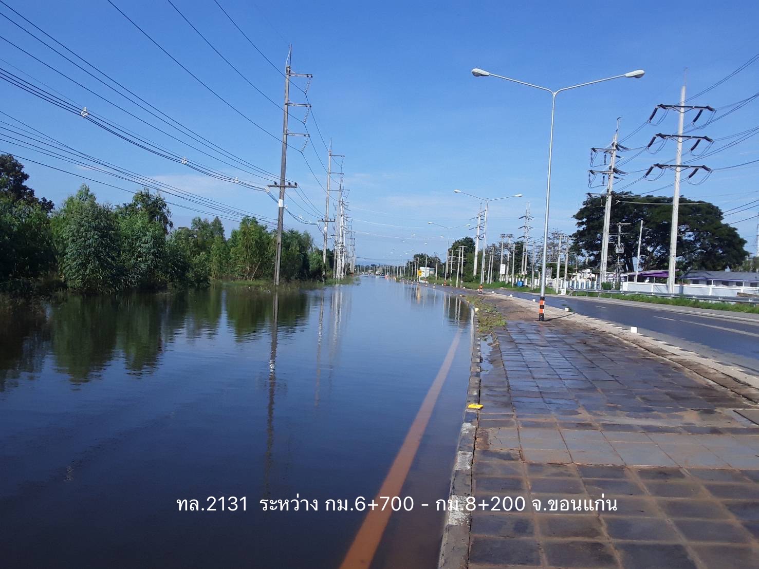 - ทางหลวงหมายเลข 2131 บ้นสะอาด – เหล่านางาม ในพื้นที่ อ.เมือง ช่วง กม.ที่ 6+700 – 7+200 ระดับน้ำ 60 ซม. การจราจรไม่สามารถผ่านได้