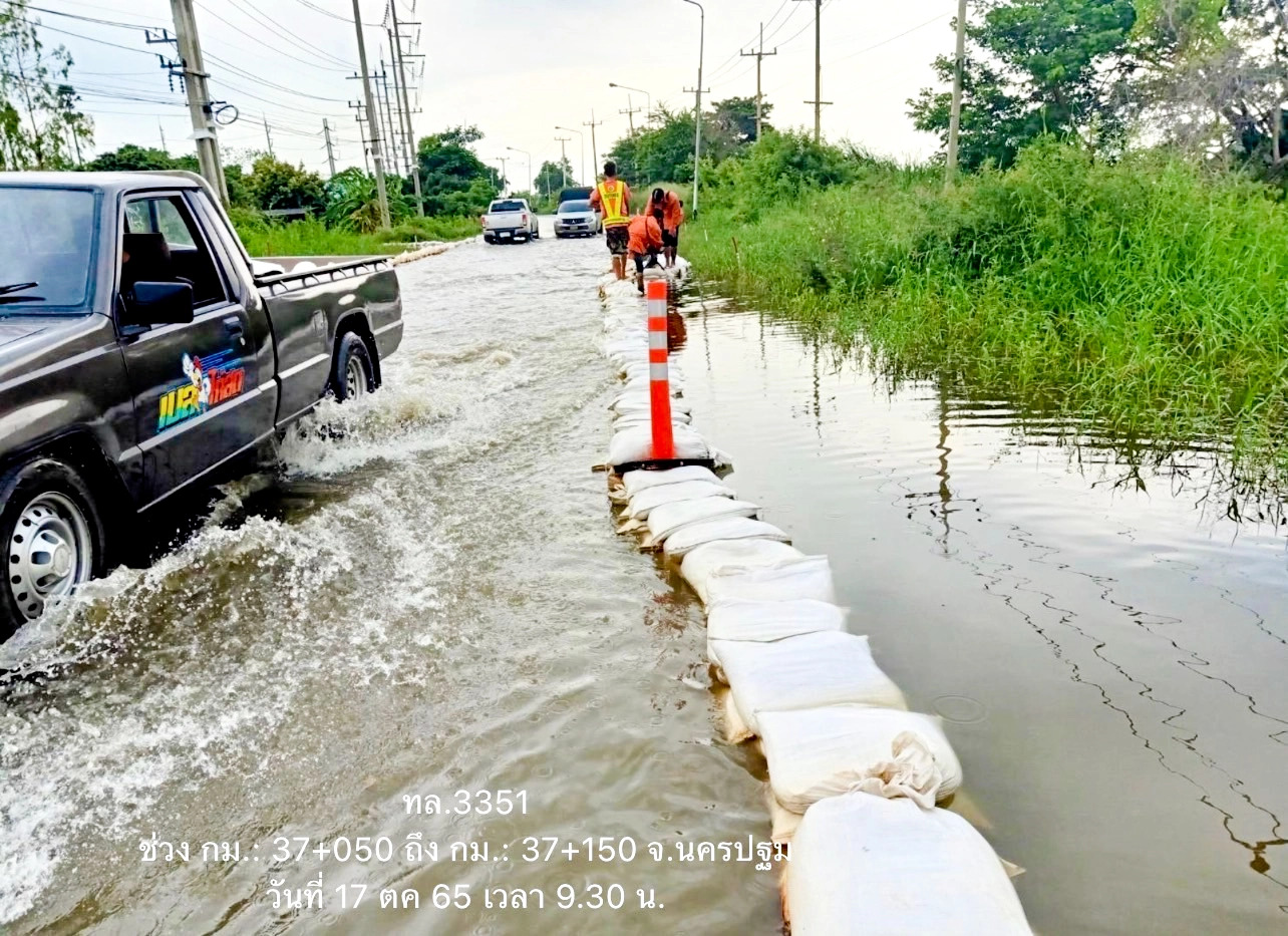 นายสราวุธ ทรงศิวิไล อธิบดีกรมทางหลวง เปิดเผยว่า จากสถานการณ์น้ำท่วมในหลายพื้นที่ ส่งผลให้ทางหลวงบางเส้นทางมีน้ำท่วมสูงเป็นเหตุให้ไม่สามารถใช้สัญจรได้ตามปกติ กรมทางหลวงได้สั่งการให้ สำนักงานทางหลวง แขวงทางหลวง หมวดทางหลวงทั่วประเทศ เฝ้าระวัง และติดตามสถานการณ์อย่างใกล้ชิด หากพื้นที่ใดประสบปัญหาก็จะระดมบุคลากร นำเครื่องจักรและวัสดุอุปกรณ์เข้าให้การช่วยเหลือเพื่อเร่งระบายน้ำและบรรเทาความเดือดร้อนโดยเร็วที่สุด พร้อมกำชับให้ผู้บริหารในพื้นที่ติดตามสถานการณ์อย่างใกล้ชิด นอกจากนี้ยังติดตั้งป้ายเตือนและอุปกรณ์อำนวยความปลอดภัยแก่ผู้ใช้เส้นทาง ในขณะที่บางจังหวัดก็มีการล้างทำความสะอาดถนนหลังจากน้ำลดลงบ้างแล้ว เพื่อบรรเทาความเดือดร้อนของประชาชนให้ได้รับความสะดวกปลอดภัยในการสัญจรโดยเร็วที่สุดอย่างต่อเนื่อง ตามข้อสั่งการของ นายศักดิ์สยาม ชิดชอบ รัฐมนตรีว่าการกระทรวงคมนาคม ที่มีความห่วงใยประชาชนผู้ประสบภัยในครั้งนี้ พร้อมทั้งเฝ้าระวังตลอด 24 ชั่วโมง เพื่อช่วยประชาชนอย่างทันท่วงที พร้อมกันนี้กรมทางหลวง ได้ทำการสรุปสถานการณ์อุทกภัยและดินสไลด์บนทางหลวง โดย สถานการณ์ประจำวันที่ 17 ตุลาคม 2565 เวลา 12.30 น. พบทางหลวงถูกน้ำท่วม/ดินสไลด์ ในพื้นที่ 12 จังหวัด ได้แก่ จ.ขอนแก่น, จ.ศรีสะเกษ, จ.นครราชสีมา ,จ.หนองบัวลำภู , จ.อุบลราชธานี, จ.มหาสารคาม, จ.ยโสธร, จ.นครปฐม, จ.อ่างทอง, จ.พระนครศรีอยุธยา, จ.สิงห์บุรี และ จ.นครสวรรค์ จำนวน 28 สายทาง 38 แห่ง การจราจรผ่านไม่ได้ 27 แห่ง ดังนี้