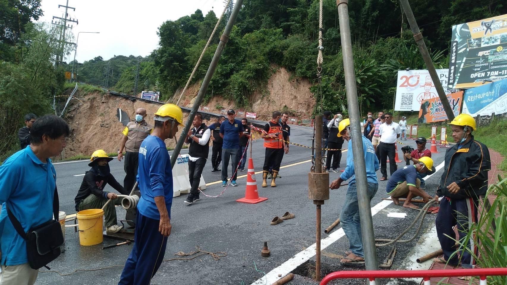 โดยวันนี้ (23 ต.ค. 65) ได้มอบหมายให้ นายยุทธนา พิทักษ์ ผู้อำนวยการแขวงทางหลวงภูเก็ต ร่วมประชุมติดตามความคืบหน้าการแก้ไขปัญหาและซ่อมแซมทางหลวงดังกล่าวร่วมกับหน่วยงานที่รับผิดชอบในจังหวัดภูเก็ต โดยแขวงทางหลวงภูเก็ตดำเนินการใช้โดรนบินสำรวจความเสียหายและรวบรวมข้อมูล สำหรับดำเนินการออกแบบและประเมินราคาการซ่อมแซมถนนชั่วคราว ในวงเงินงบประมาณ 4.9 ล้านบาท ด้วยการใช้ระบบตอกเสาเข็ม พร้อมสร้างกำแพงเป็นแนวกั้น ซึ่งจะใช้งบประมาณแก้ปัญหาภัยพิบัติฉุกเฉินของสำนักงานป้องกันและบรรเทาสาธารณภัย โดยสำนักงานป้องกันและบรรเทาสาธารณภัยจังหวัดภูเก็ตจะร่วมกับแขวงทางหลวงภูเก็ตดำเนินการจัดทำเอกสารเพื่อให้ผู้ว่าราชการจังหวัดภูเก็ตลงนามอนุมัติโครงการภายในวันนี้ จากนั้นจะเร่งดำเนินการหาผู้รับจ้างเพื่อเข้าสู่กระบวนการซ่อมแซมต่อไป สำหรับการแก้ปัญหาแบบถาวร เทศบาลเมืองกะทู้ได้เตรียมงบประมาณในการดำเนินการจำนวน 17 ล้านบาท โดยแขวงทางหลวงภูเก็ตจะยังคงรับหน้าที่ในการออกแบบสำหรับการซ่อมแซมปรับปรุงถนนตามหลักวิศวกรรมโยธา เพื่อให้มีความแข็งแรงปลอดภัยอย่างสูงสุด โดยเมื่อดำเนินการซ่อมแซมแบบชั่วคราวเพื่อให้การจราจรผ่านได้แล้วเสร็จ จะดำเนินการแก้ไขปัญหาแบบถาวรทันที ทั้งนี้ ในปัจจุบันห้ามยานพาหนะผ่านโดยเด็ดขาด กรณีประชาชนมีความจำเป็นต้องเดินผ่านเส้นทางบริเวณดังกล่าว จะมีเจ้าหน้าที่ดูแลด้านความปลอดภัย โดยประชาชนจะต้องเดินชิดไหล่ทางเท่านั้น และมีการกำหนดจุดจอดรถและจุดรับส่งทั้งสองฝั่ง และหากมีฝนตกหนักจะดำเนินการห้ามผ่านทางทันที