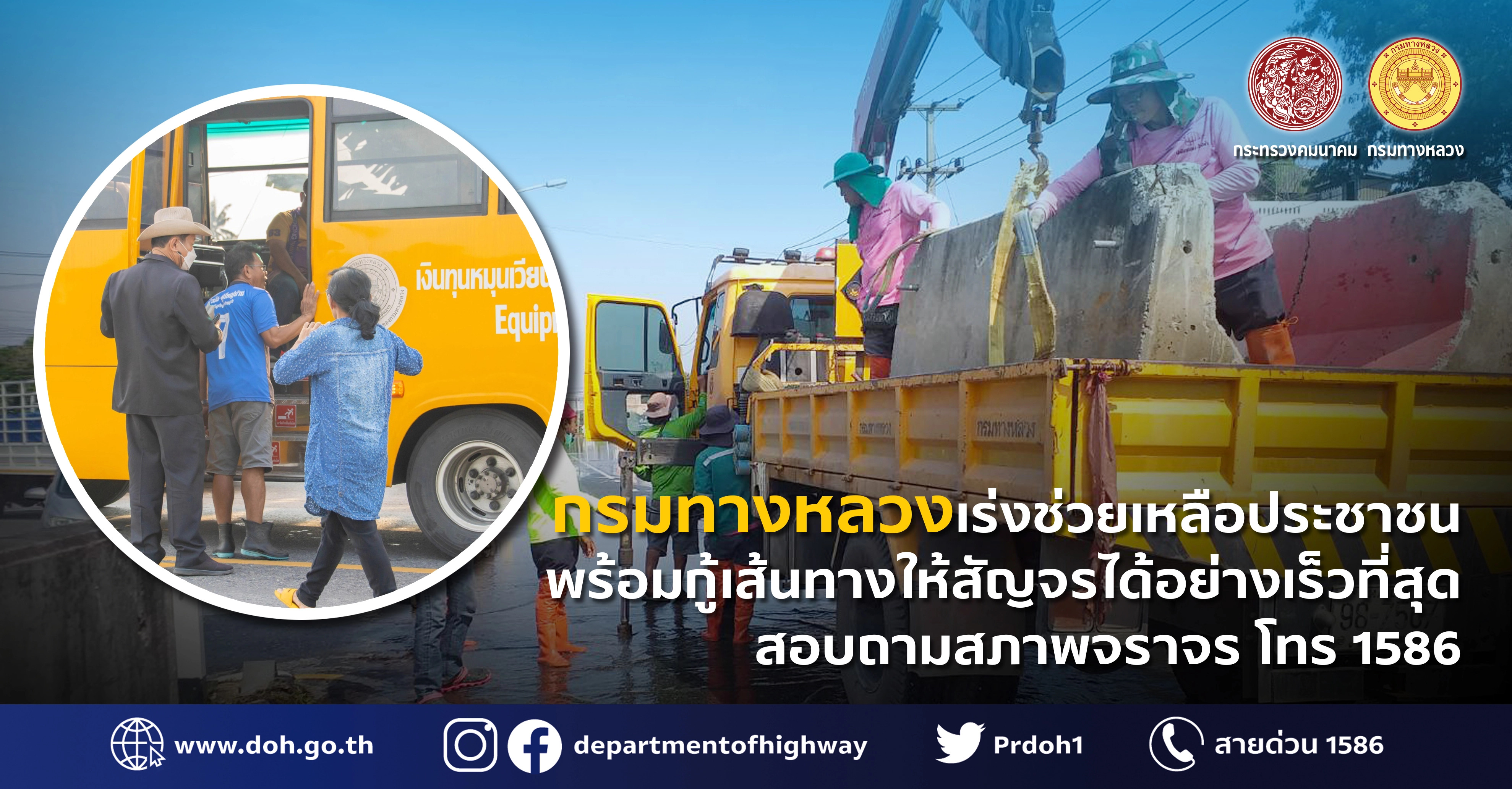 กรมทางหลวงเร่งช่วยเหลือประชาชน พร้อมกู้เส้นทางให้สัญจรได้อย่างเร็วที่สุด สอบถามสภาพเส้นทางโทร 1586