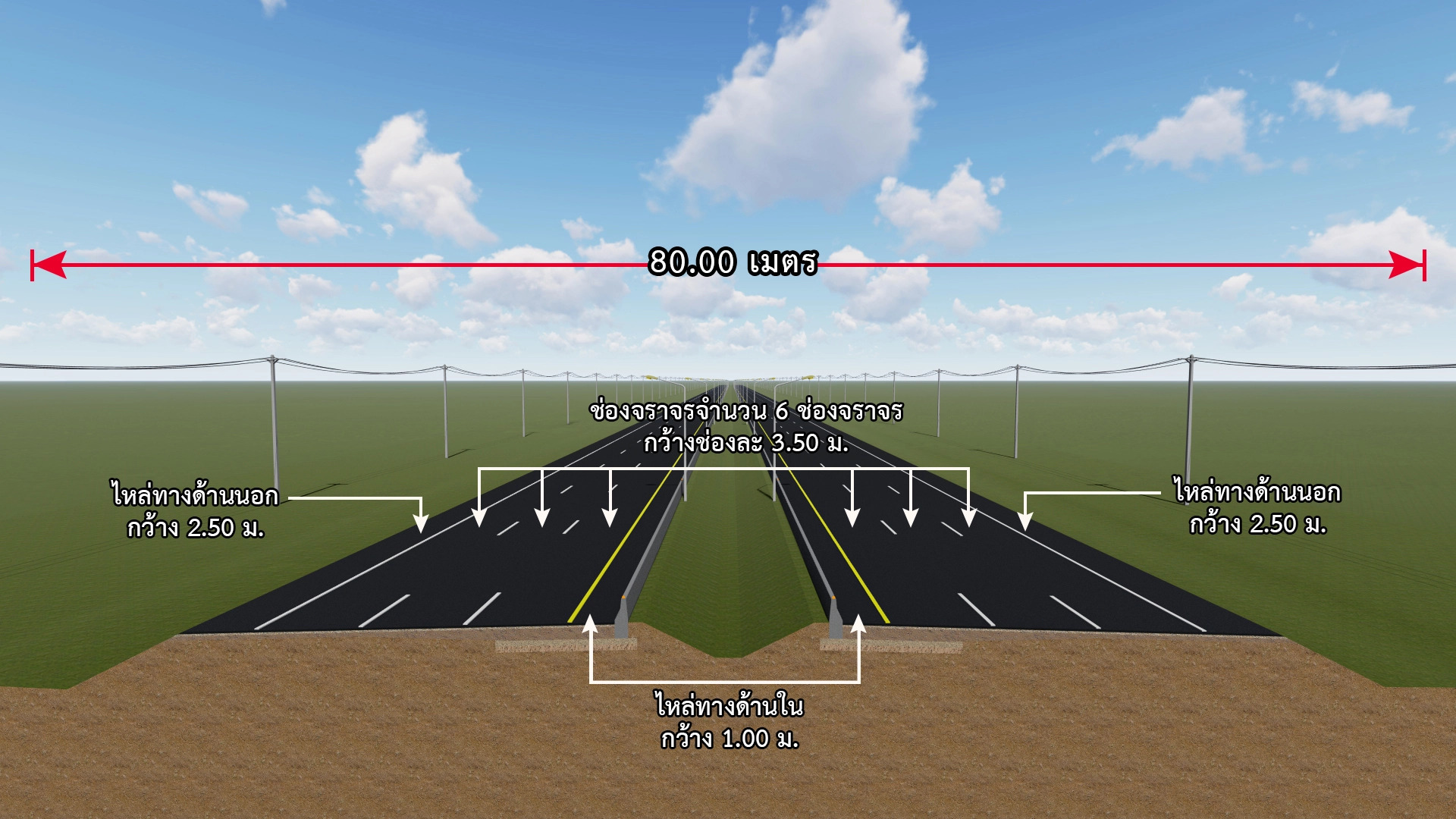 โดยรูปตัดทางหลวงของโครงการขยายทางเป็นทางหลวงขนาด 6 ช่องจราจร (ไป – กลับทิศทางละ 3 ช่องจราจร) กว้างช่องละ 3.50 เมตร ไหล่ทางด้านนอกกว้าง 2.50 เมตร ไหล่ทางด้านในกว้าง 1 เมตร แบ่งทิศทางจราจรด้วยกาะกลางแบบกดเป็นร่อง (Depressed Median) กว้าง 10.60 เมตร และติดตั้งคอนกรีตแบริเออร์ (Concrete Barrier) บริเวณขอบไหล่ทางด้านในทั้งสองฝั่ง