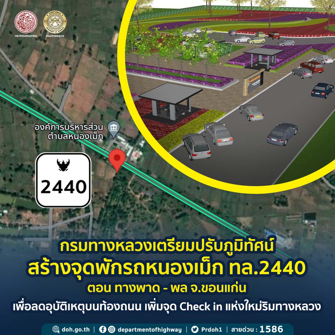 ทางหลวงหมายเลข 2440 ตอน ทางพาด - พล เป็นทางหลวงสายที่มีการเชื่อมโยงการคมนาคมและการขนส่งระหว่างจังหวัดขอนแก่น จังหวัดบุรีรัมย์ และจังหวัดนครราชสีมา ซึ่งนักท่องเที่ยวนิยมเลือกใช้เดินทางไปสู่สถานที่ท่องเที่ยวที่สำคัญของจังหวัดขอนแก่น เช่น โบราณสถานกู่บ้านเมย อำเภอหนองสองห้อง จังหวัดขอนแก่น และปราสาทเปือยน้อย อำเภอเปือยน้อย จังหวัดขอนแก่น เป็นต้น ด้วยความสำคัญนี้ กรมทางหลวงจึงดำเนินการนโยบายการพัฒนาพื้นที่จุดพักรถเพื่ออำนวยความสะดวกให้กับประชาชนและผู้ใช้บริการทางหลวงให้สามารถเข้าพักผ่อน ลดความเมื่อยล้าจากการขับขี่ นับว่าเป็นมาตรการหนึ่งที่สำคัญในการช่วยลดปัญหาอุบัติเหตุบนทางหลวง โดยดำเนินการโครงการปรับปรุงภูมิทัศน์และสถาปัตยกรรมทางหลวง ประจำปีงบประมาณ 2568 บนทางหลวงหมายเลข 2440 ตอนทางพาด - พล ในพื้นที่สวนไผ่บ้านหนองเม็ก ตำบลหนองเม็ก อำเภอหนองสองห้อง จังหวัดขอนแก่น ระหว่าง กม.28+800 - กม.28+900 (ด้านซ้ายทาง) โดยเน้นการปรับปรุงภูมิทัศน์โดยออกแบบเป็นสวนสาธารณะ ประกอบด้วย การปรับปรุงพื้นที่จอดรถจำนวน 30 คัน สวนหย่อม ห้องน้ำสาธารณะ ศาลาเอนกประสงค์ ไฟฟ้าแสงสว่างระบบโซล่าเซลล์ ป้ายจราจร ทางเท้า ระบบโทรทัศน์วงจรปิด รวมทั้งมีเจ้าหน้าที่ดูแลความปลอดภัยให้แก่แผู้ใช้บริการตลอด 24 ชั่วโมง คาดว่าจะเริ่มดำเนินการได้ในปี 2568