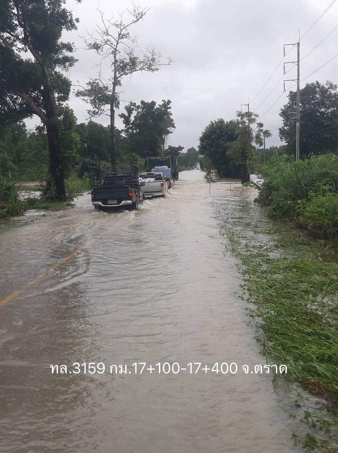 2. ทางหลวงหมายเลข 3157 แสนตุ้ง - หนองบัว ช่วง กม.7+000 – 7+500 ในพื้นที่อำเภอบ่อไร่ จังหวัดตราดระดับน้ำสูง 40 ซม. ทำให้การจราจรผ่านไม่ได้ แนะนำให้ใช้ทางหลวงท้องถิ่นเป็นทางเลี่ยง