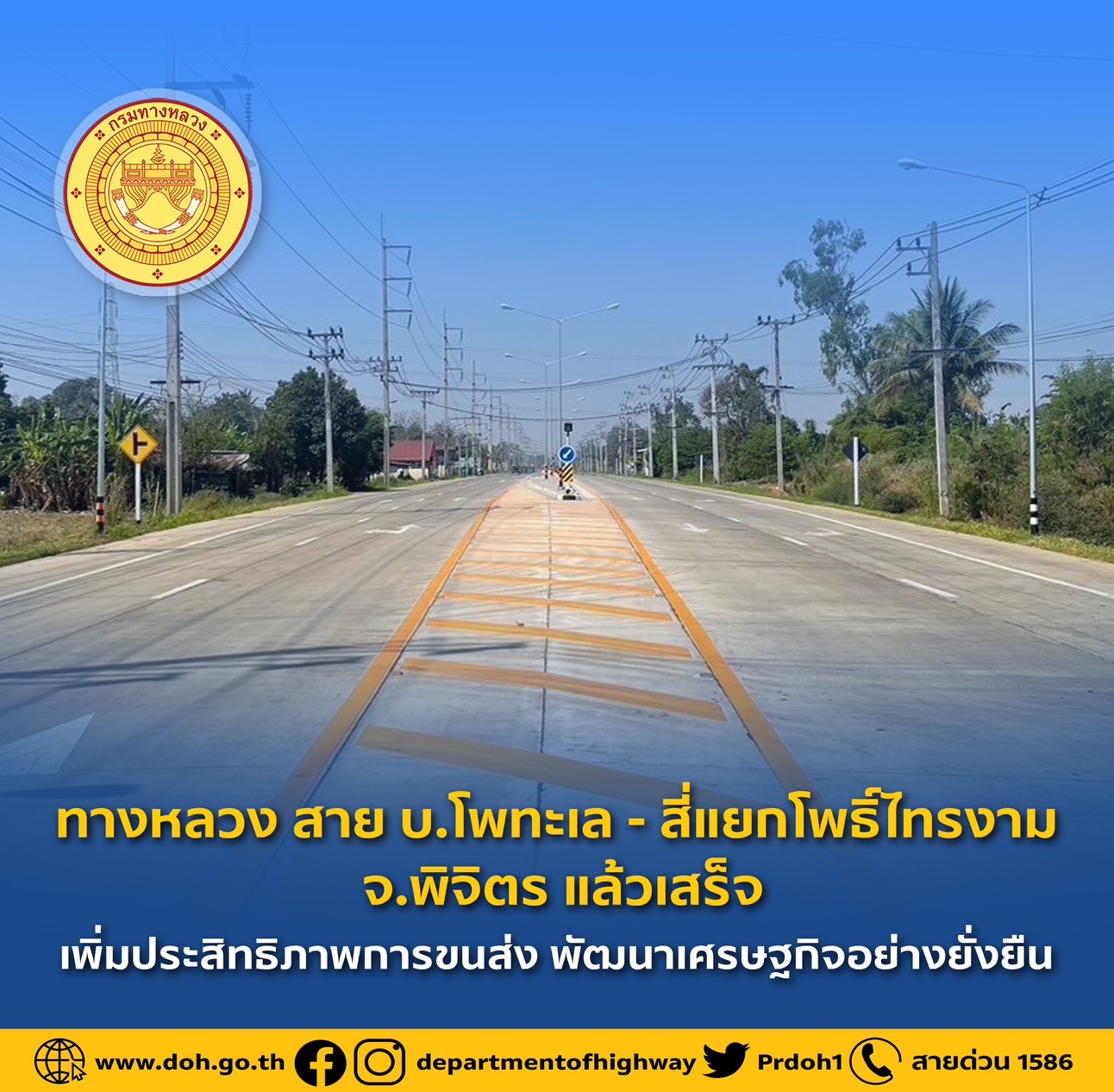 ทางหลวง สาย บ.โพทะเล - บ.สี่แยกโพธิ์ไทรงาม จ.พิจิตร แล้วเสร็จ เพิ่มประสิทธิภาพการขนส่ง พัฒนาเศรษฐกิจอย่างยั่งยืน