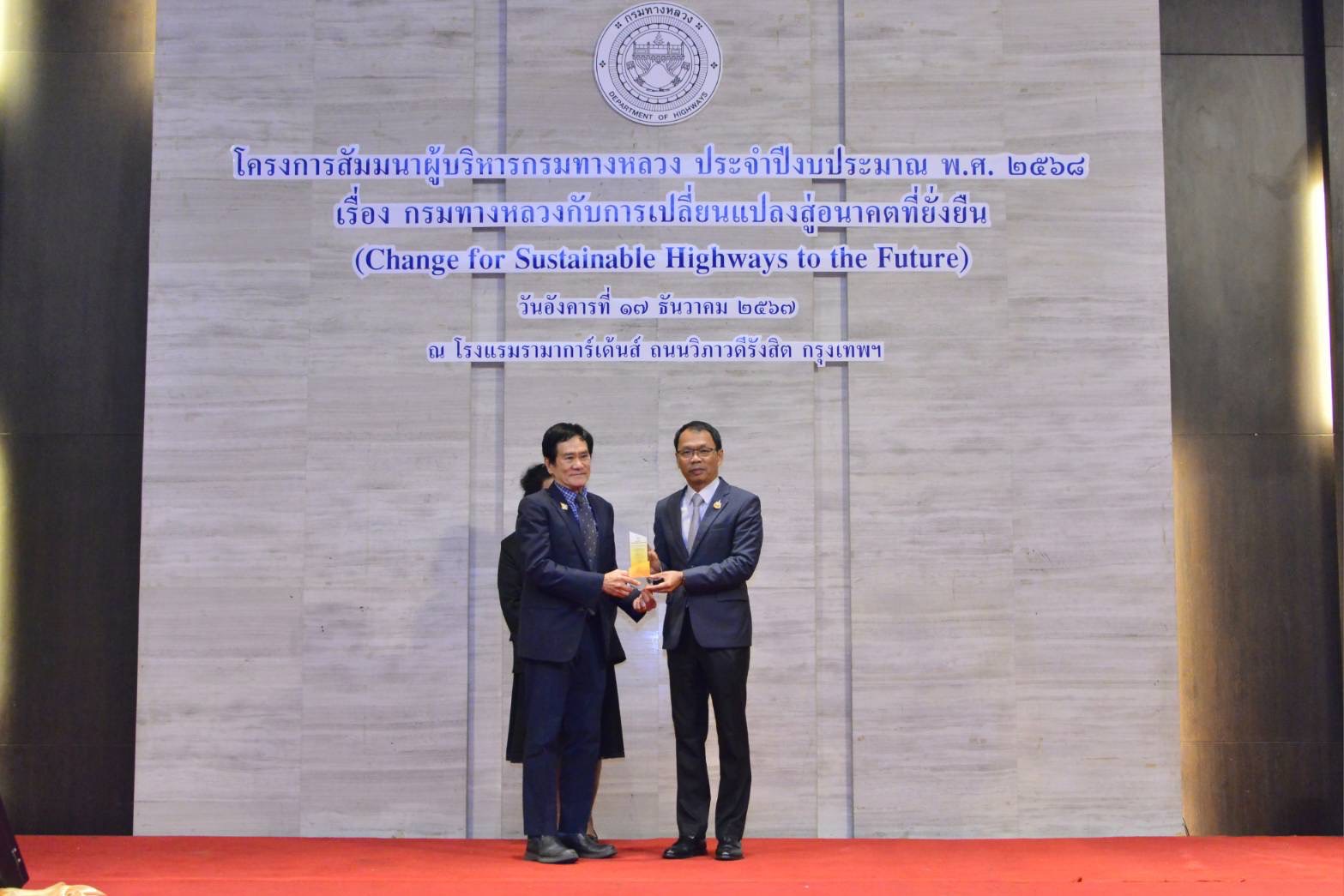 นายอภิรัฐ ไชยวงศ์น้อย อธิบดีกรมทางหลวง ได้กล่าวหลังเปิดโครงการสัมมนาผู้บริหารกรมทางหลวง ประจำปีงบประมาณ พ.ศ. 2568 เรื่อง กรมทางหลวงกับการเปลี่ยนแปลงสู่อนาคตที่ยั่งยืน (Change for Sustainable Highways to the Future) ว่า การสัมมนาในครั้งนี้เป็นการสร้างความเข้าใจเกี่ยวกับนโยบายและ แนวทางการปฏิบัติราชการของกรมทางหลวงประจำปีงบประมาณ พ.ศ. 2568 โดยมีวัตถุประสงค์เพื่อให้ผู้บริหารได้รับทราบนโยบาย ในการขับเคลื่อนนโยบายและเป้าหมายการบริหารงานของกรมทางหลวงในทุกมิติ ด้วยแนวทางปฏิบัติงานเชิงรุกในยุคดิจิทัลได้อย่างมีประสิทธิภาพและเกิดประโยชน์สูงสุด ตอบสนองนโยบายการบริหารราชการแผ่นดินของรัฐบาลได้อย่างมีผลสัมฤทธิ์และเป็นรูปธรรม รวมถึงการได้เพิ่มพูนความรู้ในเรื่องความก้าวหน้าของเทคโนโลยีปัญญาประดิษฐ์ (AI) ในการนําไปใช้ประโยชน์ เพื่อยกระดับขีดความสามารถ สร้างการเปลี่ยนแปลงผลลัพธ์ให้กับองค์กรและความรู้เกี่ยวกับกลยุทธ์เชิงรุกเพื่อพัฒนาภาพลักษณ์องค์กรในยุคดิจิทัล