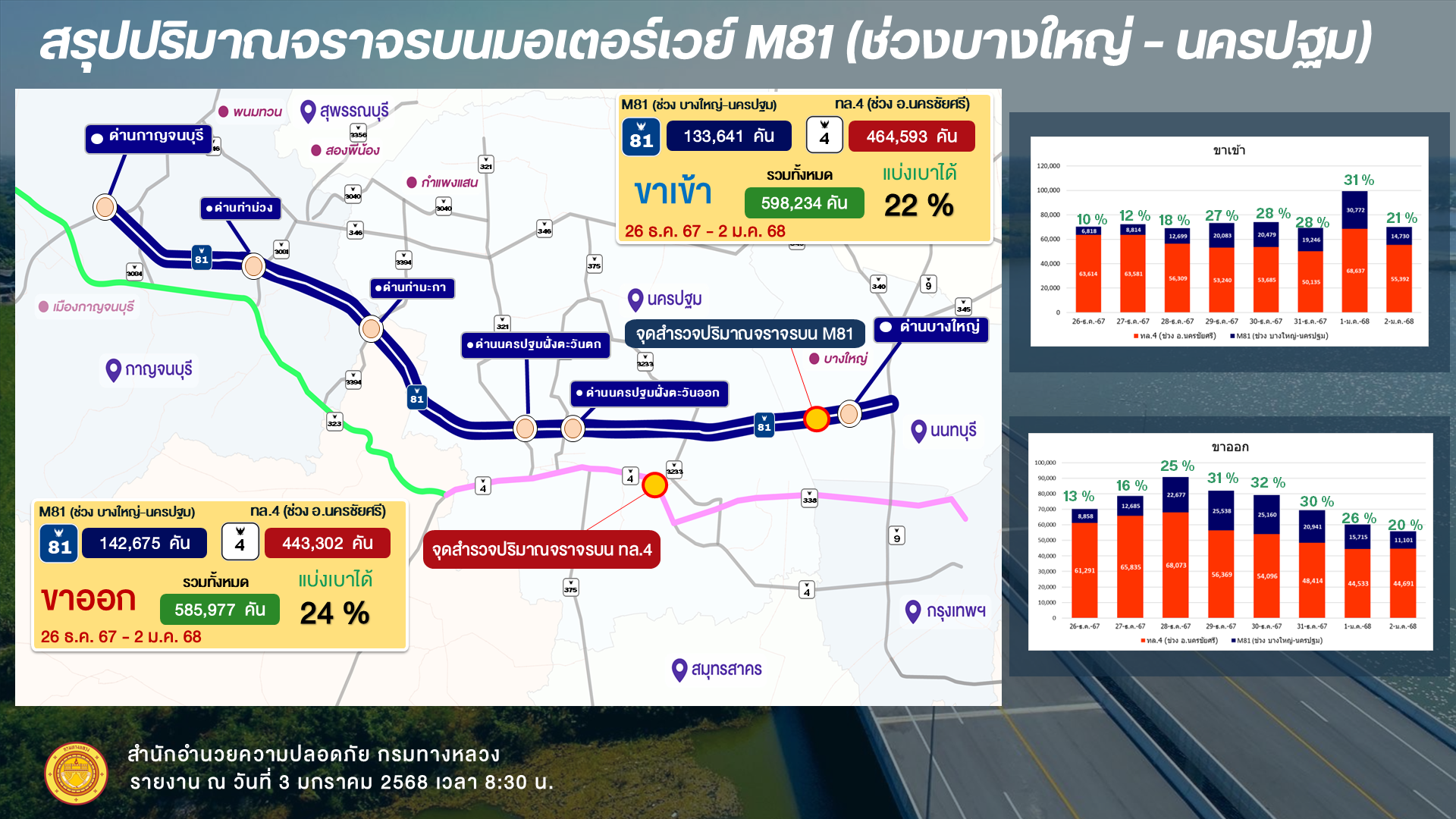 3 มกราคม 2568 – นายอภิรัฐ ไชยวงศ์น้อย อธิบดีกรมทางหลวง เปิดเผยว่า การเปิดทดลองให้บริการทางหลวงพิเศษระหว่างเมืองหมายเลข 81 สายบางใหญ่ – กาญจนบุรี หรือมอเตอร์เวย์ M81 ได้รับการตอบรับอย่างดีเยี่ยมจากประชาชน โดยในช่วงเปิดให้ทดลองใช้ฟรีตลอดเทศกาลปีใหม่ 2568 (26 ธ.ค. 67 - 2 ม.ค. 68) มีปริมาณรถยนต์ใช้เส้นทาง M81 ช่วงบางใหญ่ - นครปฐม รวมทั้งสิ้น 276,316 คัน สามารถแบ่งเบาปริมาณจราจรบนทางหลวงหมายเลข 4 (ถนนเพชรเกษม) ช่วง อ.นครชัยศรี จ.นครปฐม ได้ 23% ส่วนเส้นทาง M81 ช่วงนครปฐม - กาญจนบุรี มีปริมาณรถยนต์ใช้เส้นทาง รวมทั้งสิ้น 219,181 คัน สามารถแบ่งเบาปริมาณจราจรบนทางหลวงหมายเลข 323 ช่วง อ.ท่าม่วง จ.กาญจนบุรี ได้ถึง 43% สะท้อนให้เห็นถึงประโยชน์ของโครงการ M81 ในการอำนวยความสะดวก ร่นระยะเวลาเดินทาง และช่วยระบายการจราจรบนเส้นทางหลักจากกรุงเทพฯ และปริมณฑล สู่ภาคตะวันตกและภาคใต้ ผ่านจังหวัดนครปฐม และจังหวัดกาญจนบุรี ซึ่งเป็นเมืองท่องเที่ยวสำคัญ ไปสู่จังหวัดต่าง ๆ เช่น ราชบุรี เพชรบุรี ประจวบคีรีขันธ์ ได้อย่างรวดเร็ว