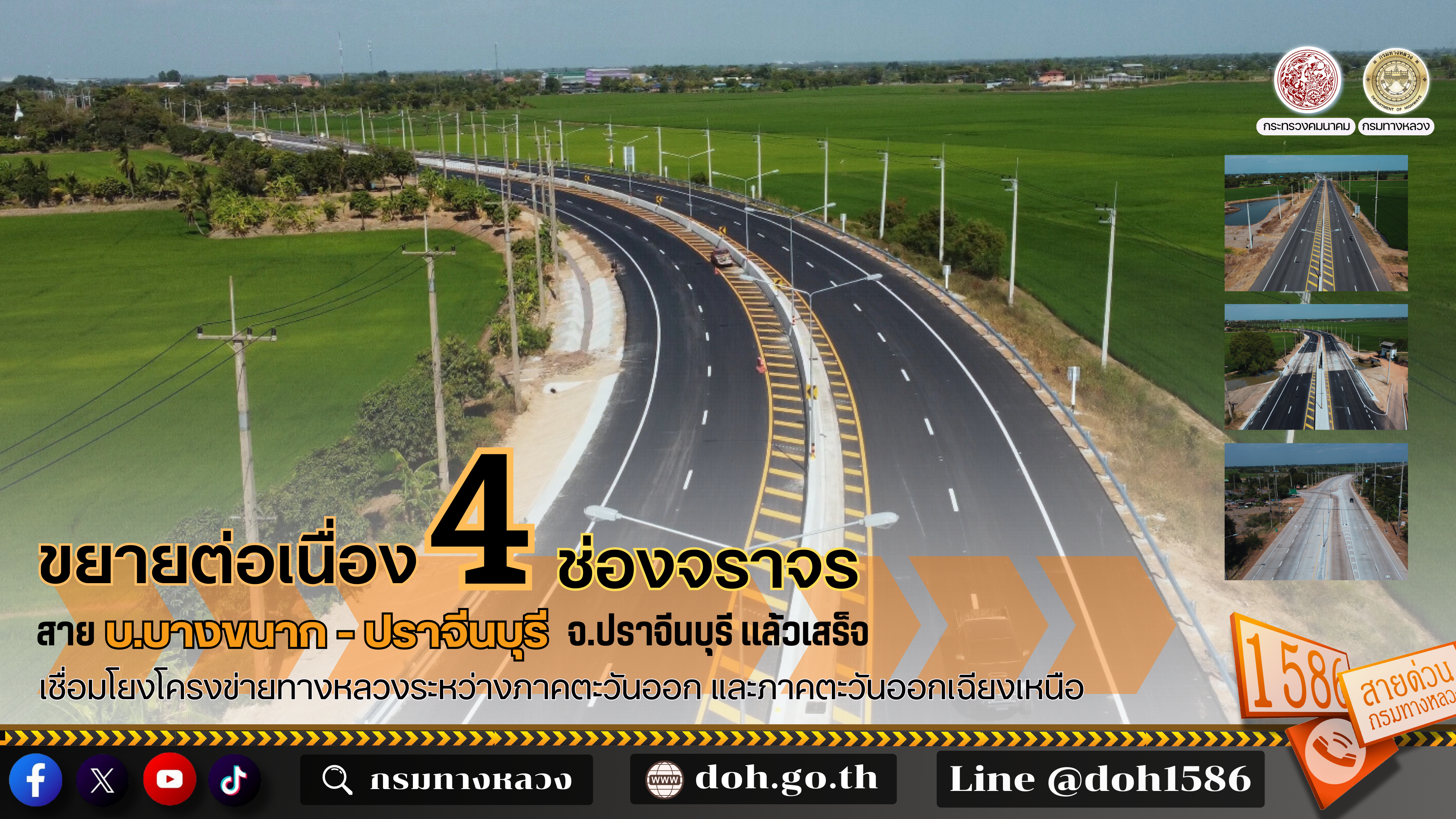 กรมทางหลวงก่อสร้างขยายทางหลวงหมายเลข 3481 สาย บ.บางขนาก - ปราจีนบุรี จ.ปราจีนบุรี แล้วเสร็จ เพื่อเพิ่ม ประสิทธิภาพในการรองรับปริมาณจราจรที่เพิ่มสูงขึ้น และเสริมสร้างโครงข่ายการคมนาคมระหว่างภาคตะวันออกกับภาคตะวันออกเฉียงเหนือ