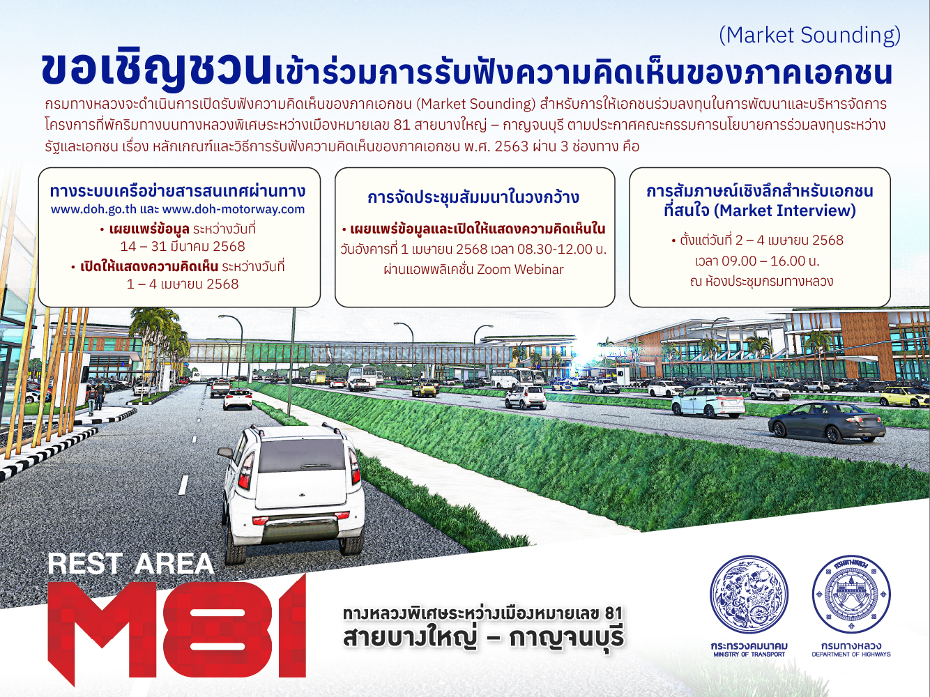 กรมทางหลวงจะดำเนินการเปิดรับฟังความคิดเห็นภาคเอกชน (Market Sounding) สำหรับการให้เอกชนร่วมลงทุนในการพัฒนาและบริหารจัดการโครงการที่พักริมทางบนทางหลวงพิเศษระหว่างเมืองหมายเลข 81