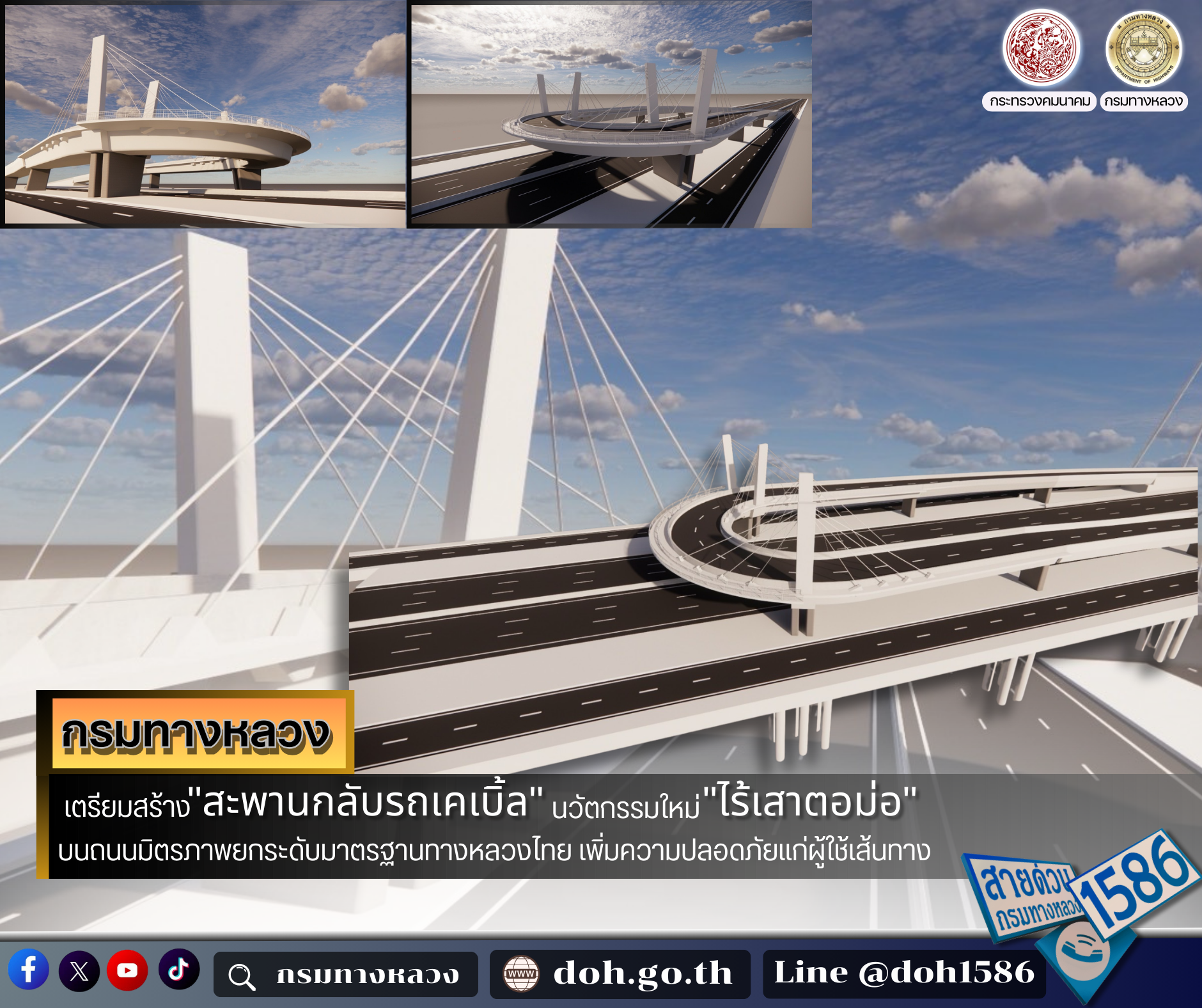 สำหรับนวัตกรรมสะพานกลับรถแบบเคเบิ้ลนี้ เป็นการพลิกโฉมแนวคิดการออกแบบสะพานกลับรถแบบดั้งเดิม โดยใช้หลักการออกแบบเชิงวิศวกรรมที่ทันสมัย ให้เคเบิ้ลรับน้ำหนักแทนเสาตอม่อ เพื่อเพิ่มประสิทธิภาพในการรับน้ำหนัก และลดการใช้เสาตอม่อกลางถนน ซึ่งเป็นอุปสรรคต่อการจราจรและเสี่ยงต่อการเกิดอุบัติเหตุ ระบบเคเบิ้ลรับแรงนี้ ไม่เพียงแต่ช่วยเพิ่มความปลอดภัยในการเดินทาง และลดอุบัติเหตุจากการชนเสากลางถนน แต่ยังช่วยลดผลกระทบต่อสภาพแวดล้อม เพิ่มทัศนียภาพที่สวยงาม และเปิดพื้นที่ด้านล่างสะพานให้สามารถใช้ประโยชน์ได้อย่างเต็มที่ อีกทั้งโครงสร้างยังถูกออกแบบให้รองรับยานพาหนะทุกประเภท ด้วยความยาวของสะพานที่ออกแบบให้เหมาะสมกับสภาพพื้นที่และชั้นดิน พร้อมรองรับการใช้งานในระยะยาว โดยคำนึงถึงความสวยงามทางสถาปัตยกรรม และสอดคล้องกับสภาพแวดล้อมโดยรอบ รวมถึงปัจจัยสำคัญที่ทำให้กรมทางหลวงเลือกใช้เทคโนโลยีสะพานกลับรถเคเบิ้ลสำหรับโครงการนี้ คือ ข้อจำกัดด้านกายภาพของพื้นที่ เนื่องจากบริเวณดังกล่าวมีเขตทางจำกัด และไม่มีพื้นที่บริเวณเกาะกลางถนนเพียงพอต่อการก่อสร้างเสาตอม่อแบบปกติ ทำให้การใช้เทคโนโลยีสะพานเคเบิ้ลเป็นทางเลือกที่เหมาะสมและตอบโจทย์ลักษณะจำเพาะของพื้นที่ได้ดีที่สุด