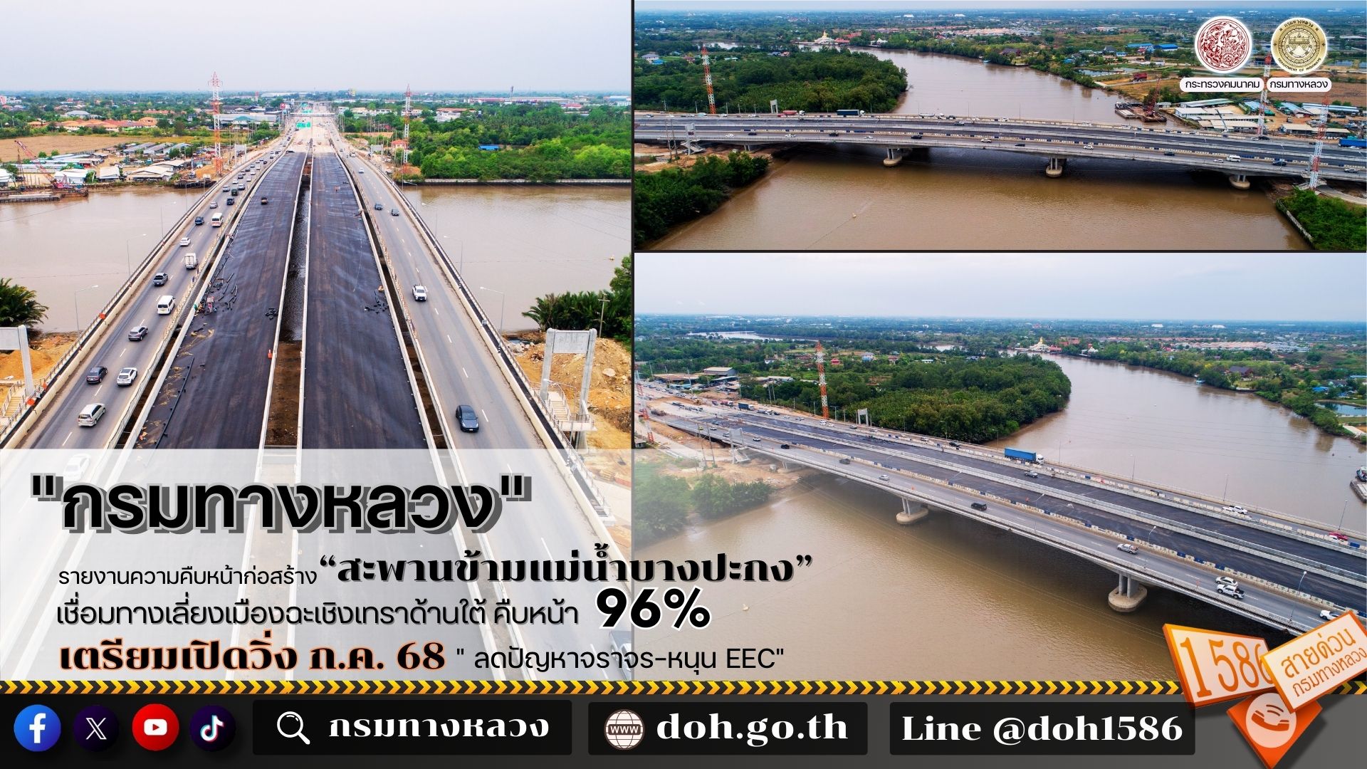 "กรมทางหลวง กระทรวงคมนาคม รายงานความคืบหน้าโครงการก่อสร้างสายทางเลี่ยงเมืองฉะเชิงเทราด้านใต้ (สะพานข้ามแม่น้ำบางปะกง) อ.เมือง จ.ฉะเชิงเทรา บนทางหลวงหมายเลข 365 ทางเลี่ยงเมืองฉะเชิงเทราด้านใต้ ระหว่าง กม.2+875 ถึง กม. 3+825 ซึ่งเป็นโครงการสำคัญมูลค่า 978.7 ล้านบาท ที่มุ่งแก้ไขปัญหาจราจรติดขัดในพื้นที่ เชื่อมโยงโครงข่ายคมนาคม และสนับสนุนการพัฒนาเขตเศรษฐกิจพิเศษภาคตะวันออก (EEC) ขณะนี้โครงการฯ มีความคืบหน้า 96.74% คาดว่าจะสามารถเปิดให้ประชาชนสัญจรได้ในเดือนกรกฎาคม 2568