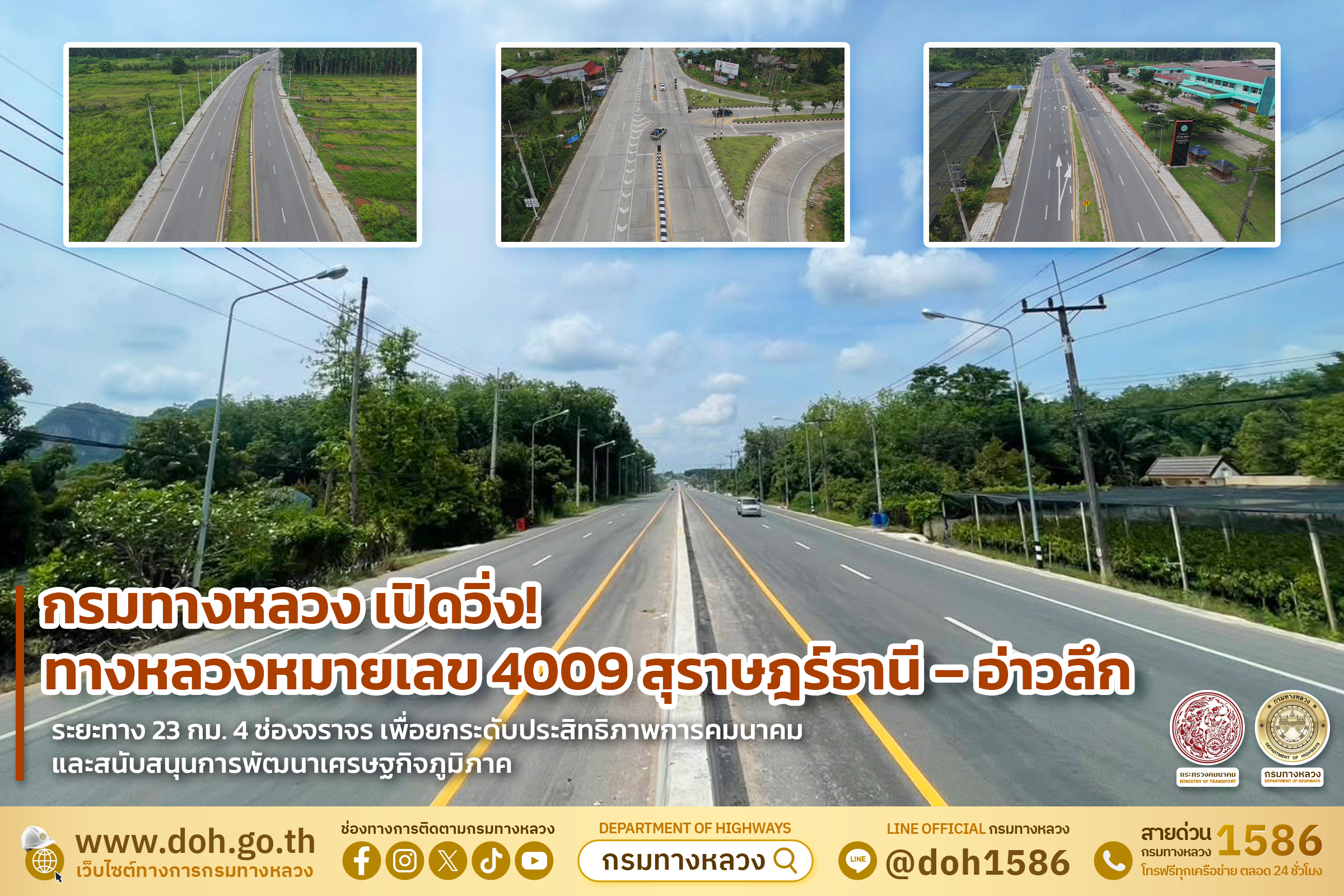 กรมทางหลวงขยาย 4 ช่องจราจร ทางหลวงหมายเลข 4009 สุราษฎร์ธานี – อ่าวลึก ตอน บ.ซอยสิบ – อ.บ้านนาสาร จ.สุราษฎร์ธานี ระยะทาง 23 กม. เพื่อยกระดับประสิทธิภาพการคมนาคมและสนับสนุนการพัฒนาเศรษฐกิจภูมิภาค