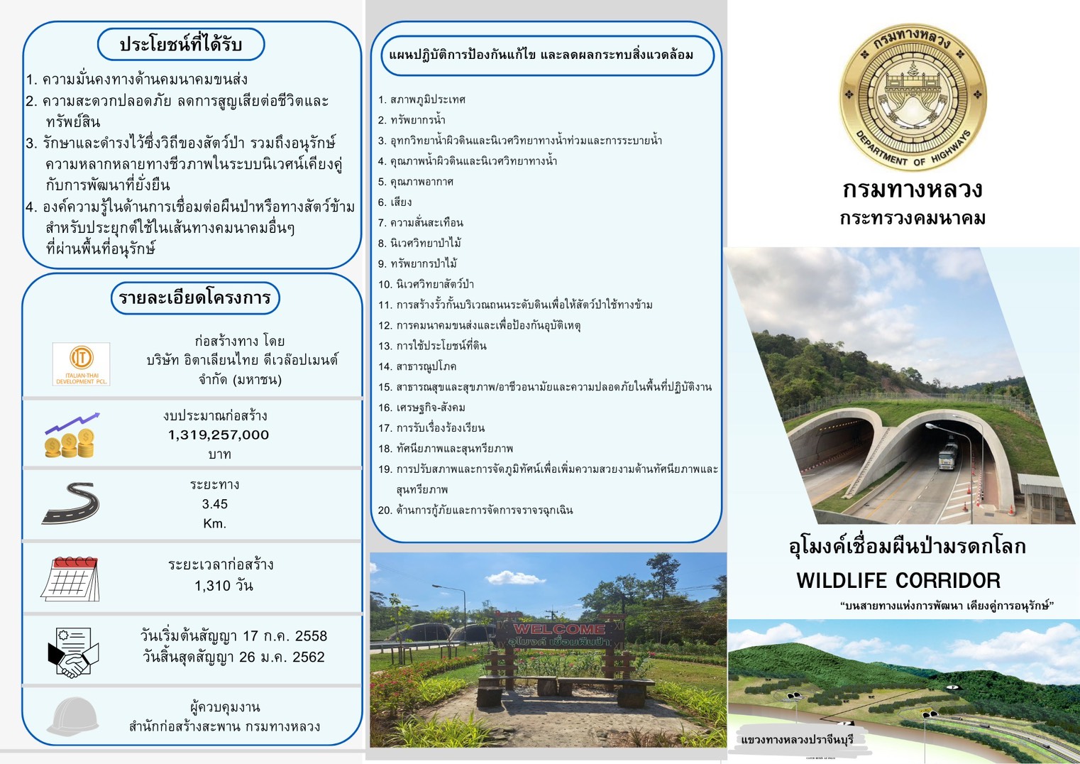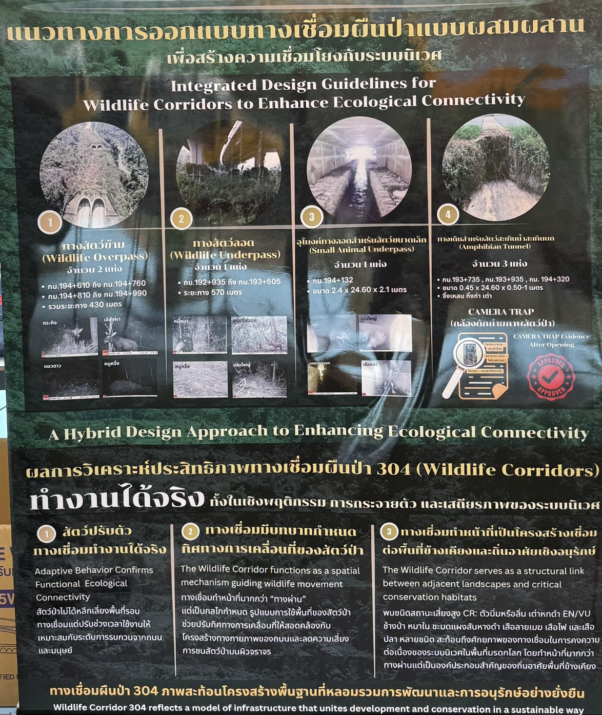 ในการนี้ กรมทางหลวงได้รายงานแนวคิดการก่อสร้างอุโมงค์เชื่อมผืนป่า บนทางหลวงหมายเลข 304 ซึ่งเป็นเส้นทางหลักที่ตัดผ่านพื้นที่อุทยานแห่งชาติเขาใหญ่และอุทยานแห่งชาติทับลาน ซึ่งเป็นพื้นที่ป่ามรดกโลก โดยออกแบบเป็นอุโมงค์ระดับพื้นถนน และจัดให้มีพื้นที่ด้านบนเป็นทางเชื่อมให้สัตว์ป่าสามารถสัญจรได้อย่างปลอดภัย สอดคล้องกับสภาพพื้นที่และพฤติกรรมสัตว์ป่า ทั้งนี้ โครงการดังกล่าวเป็นการบูรณาการร่วมกันระหว่างกรมทางหลวง กระทรวงทรัพยากรธรรมชาติและสิ่งแวดล้อม และหน่วยงานด้านการอนุรักษ์ทรัพยากรธรรมชาติและสิ่งแวดล้อม เพื่อพัฒนาโครงสร้างพื้นฐานควบคู่กับการคุ้มครองระบบนิเวศอย่างสมดุล