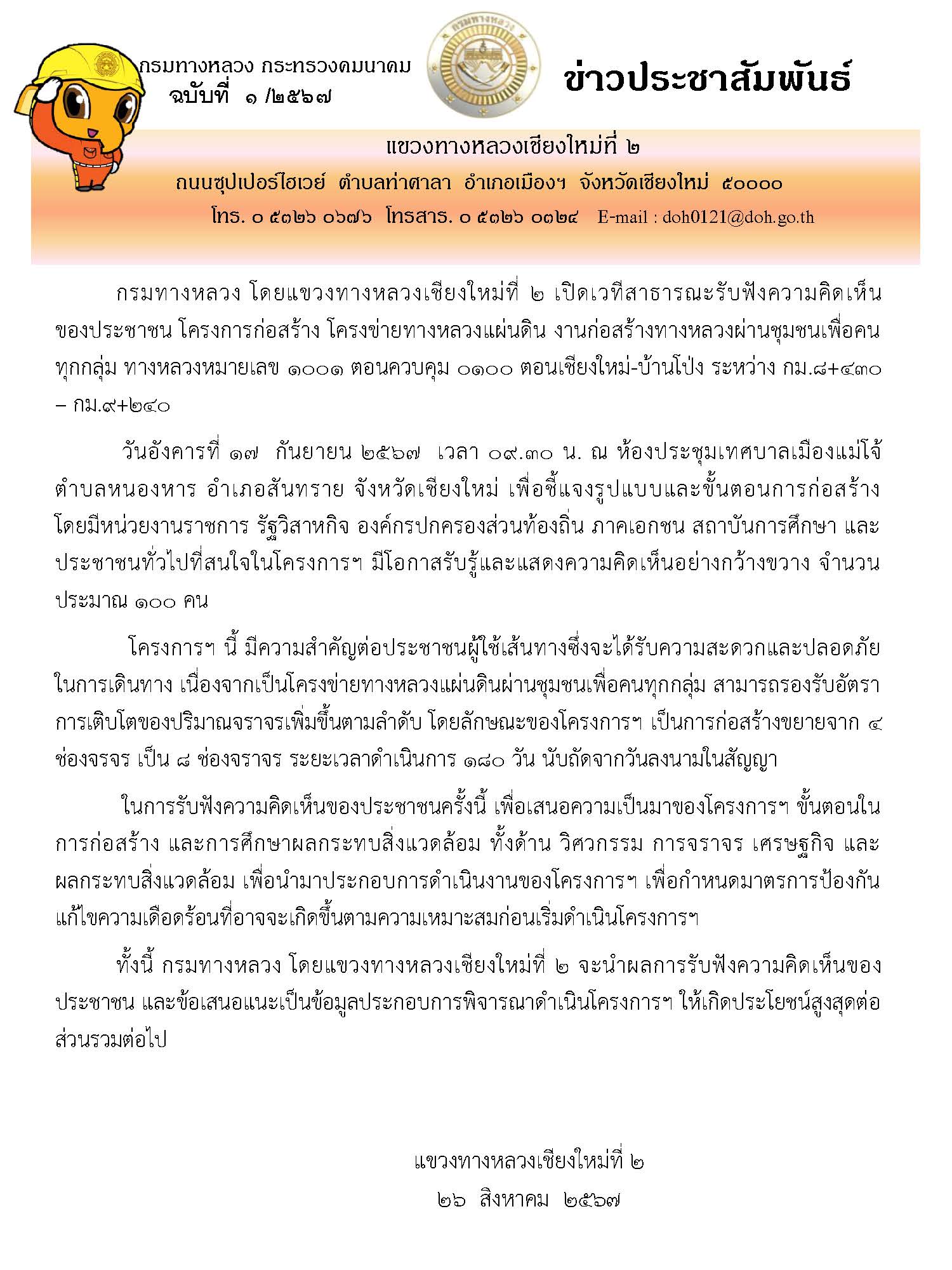 ประกาศแขวงทางหลวงเชียงใหม่ที่ ๒ เรื่อง สรุปผลการรับฟังความคิดเห็นของประชาชน โครงการก่อสร้าง โครงข่ายทางหลวงแผ่นดิน งานก่อสร้างทางผ่านชุมชนเพื่อคนทุกกลุ่ม ทางหลวงหมายเลข ๑๐๐๑ ตอนควบคุม ๐๑๐๐ ตอน เชียงใหม่ – บ้านโป่ง ระหว่าง กม.๘+๔๓๐ – กม.๙+๒๔๐
