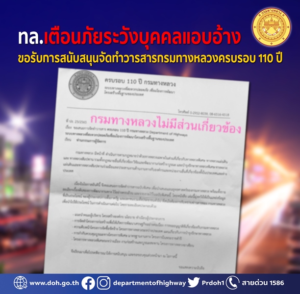 กรมทางหลวง ขอแจ้งเตือนประชาชนให้ระมัดระวังกลุ่มมิจฉาชีพที่แอบอ้างเป็นกรมทางหลวง ดำเนินการส่งหนังสือไปยังผู้ประกอบการต่างๆ เพื่อขอให้ซื้อโฆษณาในวารสารฉบับพิเศษ และเตือนอย่าหลงเชื่อโอนค่าโฆษณาเข้าบัญชีส่วนบุคคลให้กลุ่มมิจฉาชีพดังกล่าว