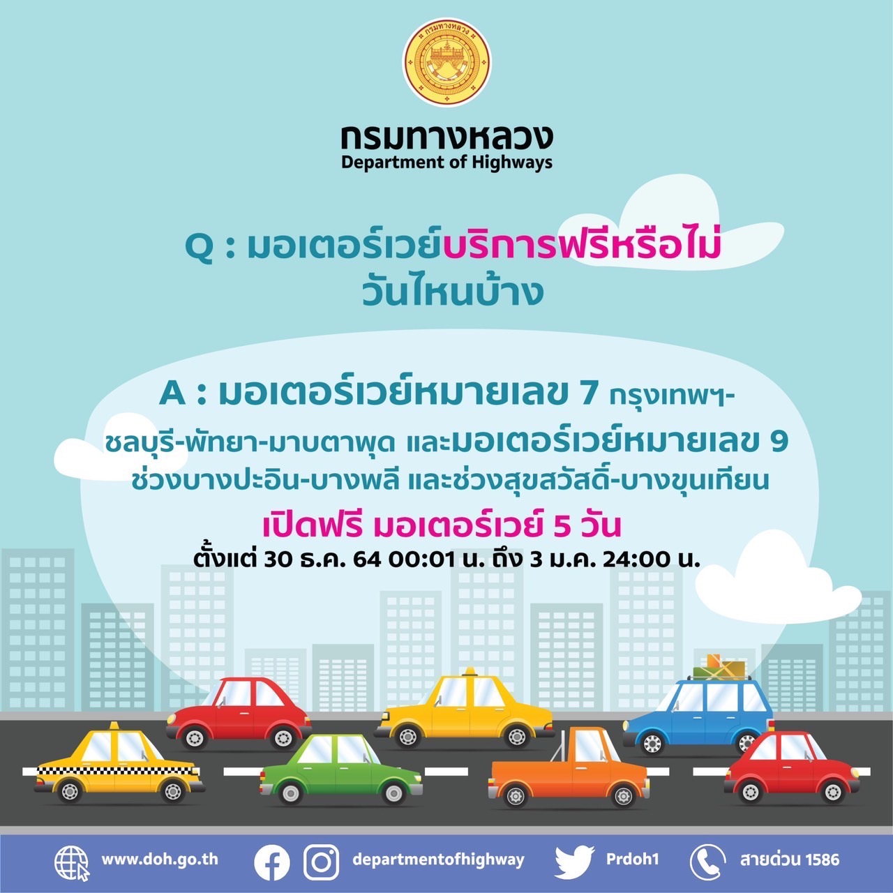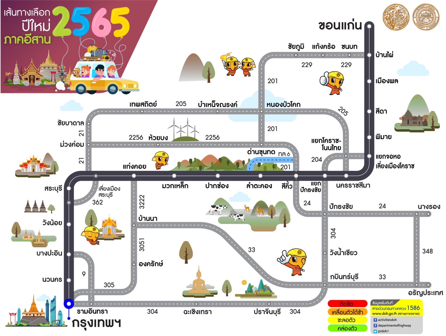 กรมทางหลวง แนะนำเส้นทางเลือกจากกรุงเทพฯสู่ภูมิภาคต่างๆ ช่วงเทศกาลปีใหม่ 2565 เพื่อให้ผู้ใช้ทางได้รับความสะดวกรวดเร็วในการเดินทาง สอบถามโทร 1586
