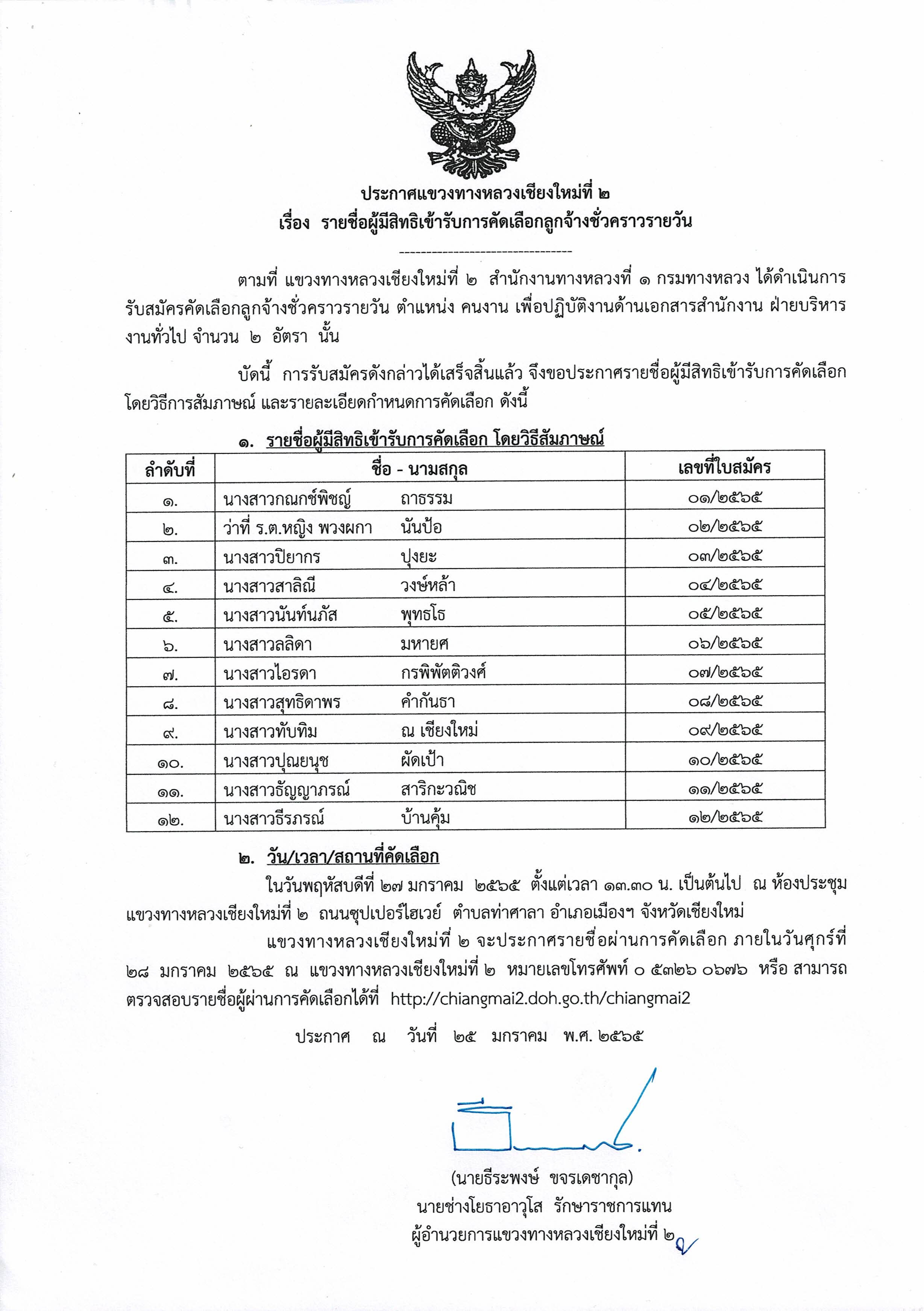 ประกาศรายชื่อผู้มีสิทธิเข้ารับการคัดเลือกลูกจ้างชั่วคราวรายวัน