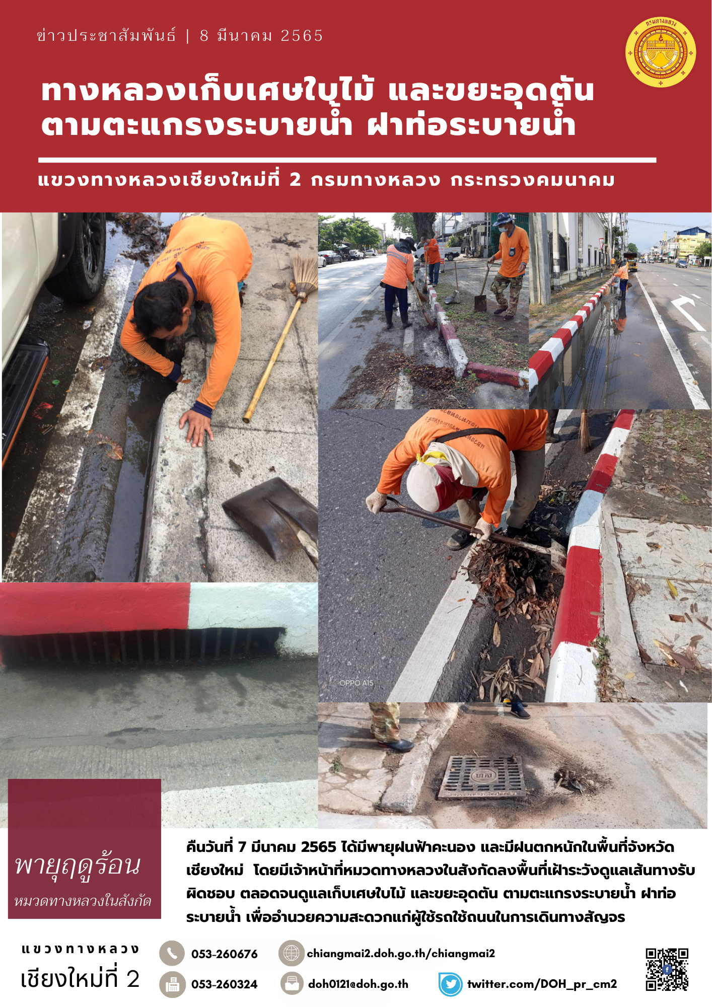 ทางหลวงเก็บเศษใบไม้ และขยะอุดตัน ตามตะแกรงระบายน้ำ ฝาท่อระบายน้ำ