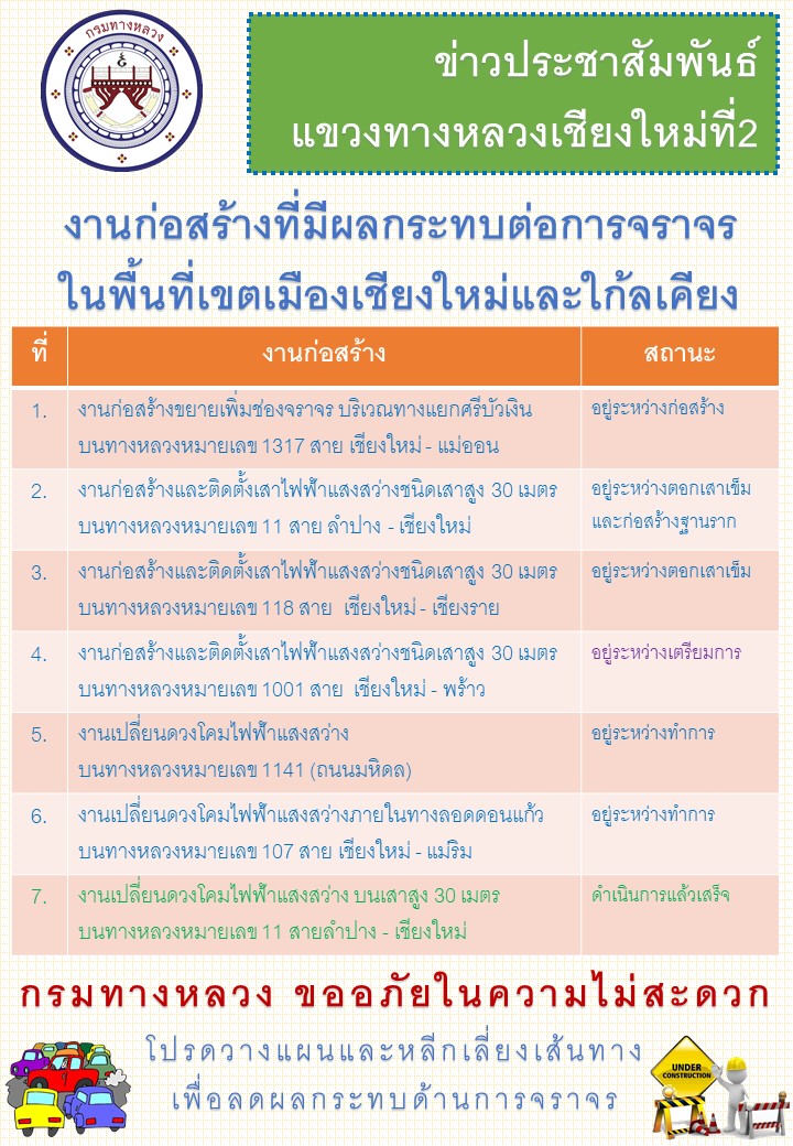 งานก่อสร้างที่ผลกระทบต่อการจราจรในพื้นที่เขตเมืองเชียงใหม่ และใกล้เคียง