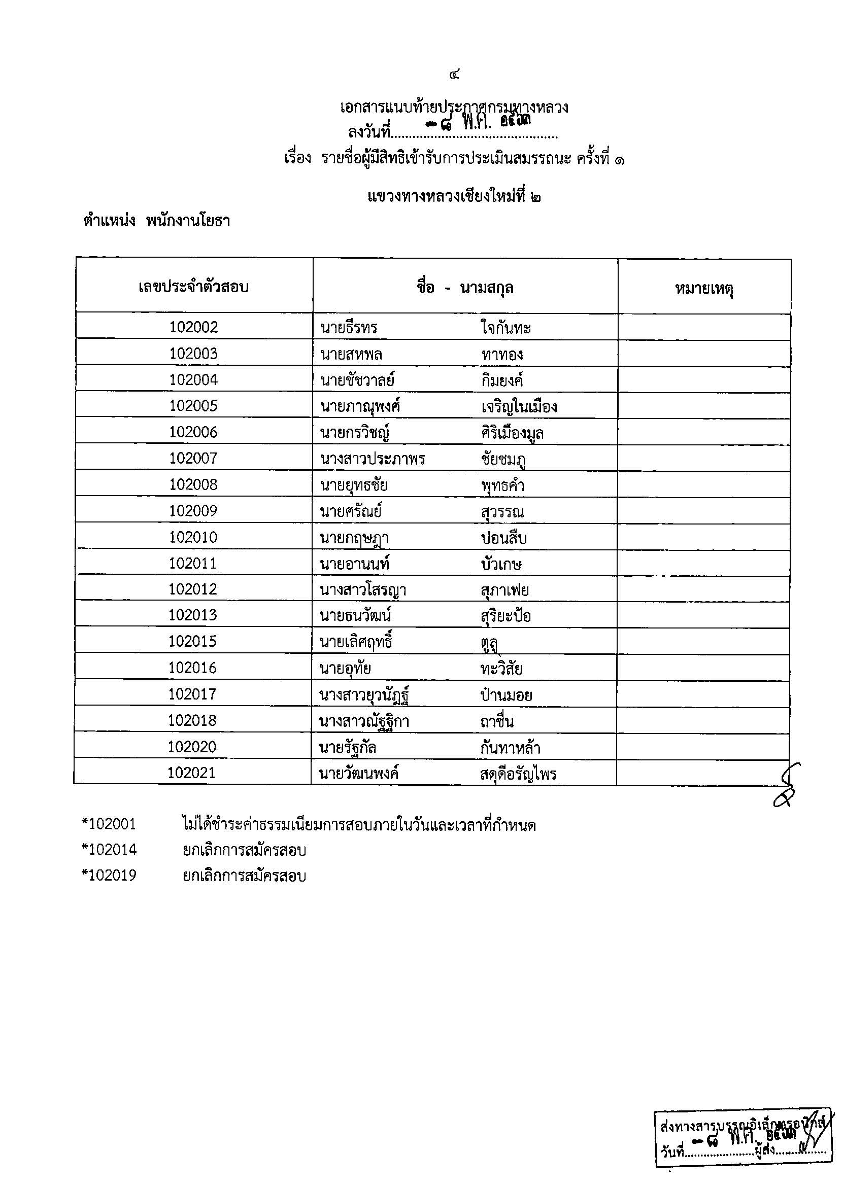 แขวงทางหลวงเชียงใหม่ที่ 2ประกาศรายชื่อผู้มีสิทธิเข้ารับการประเมินสมรรถนะ เพื่อสรรหาและเลือกสรรเป็นพนักงานราชการ ตำแหน่งพนักงานโยธา??สำหรับวัน เวลา และสถานที่ ทางสำนักงานทางหลวงที่ 1 (เชียงใหม่) จะประกาศให้ทราบในภายหลัง