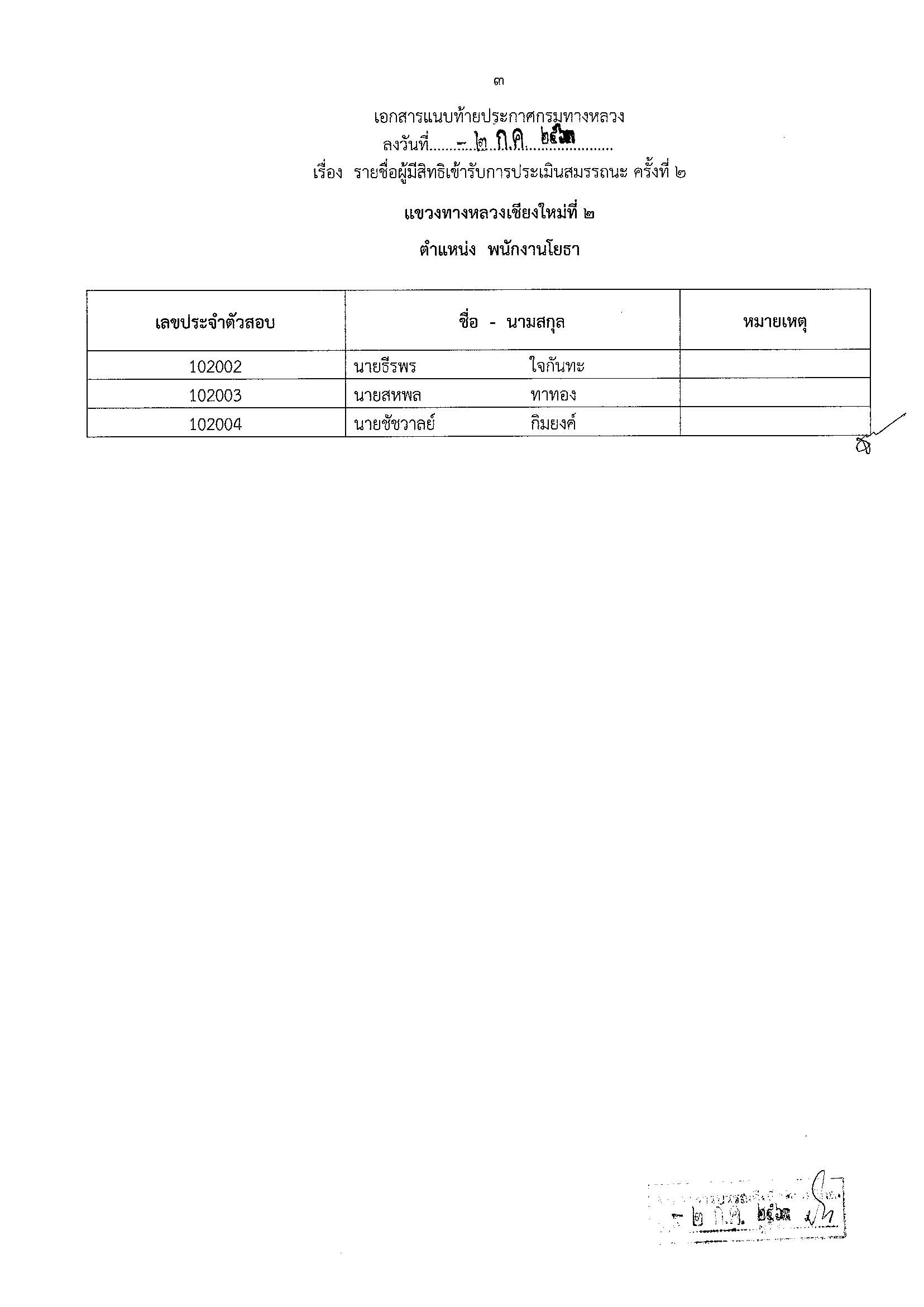 เรื่อง ประกาศรายชื่อผู้ผ่านการประเมินสมรรถนะครั้งที่ 1 และมีสิทธิ์เข้ารับการประเมินสมรรถนะครั้งที่ 2 ตำแหน่ง พนักงานโยธา