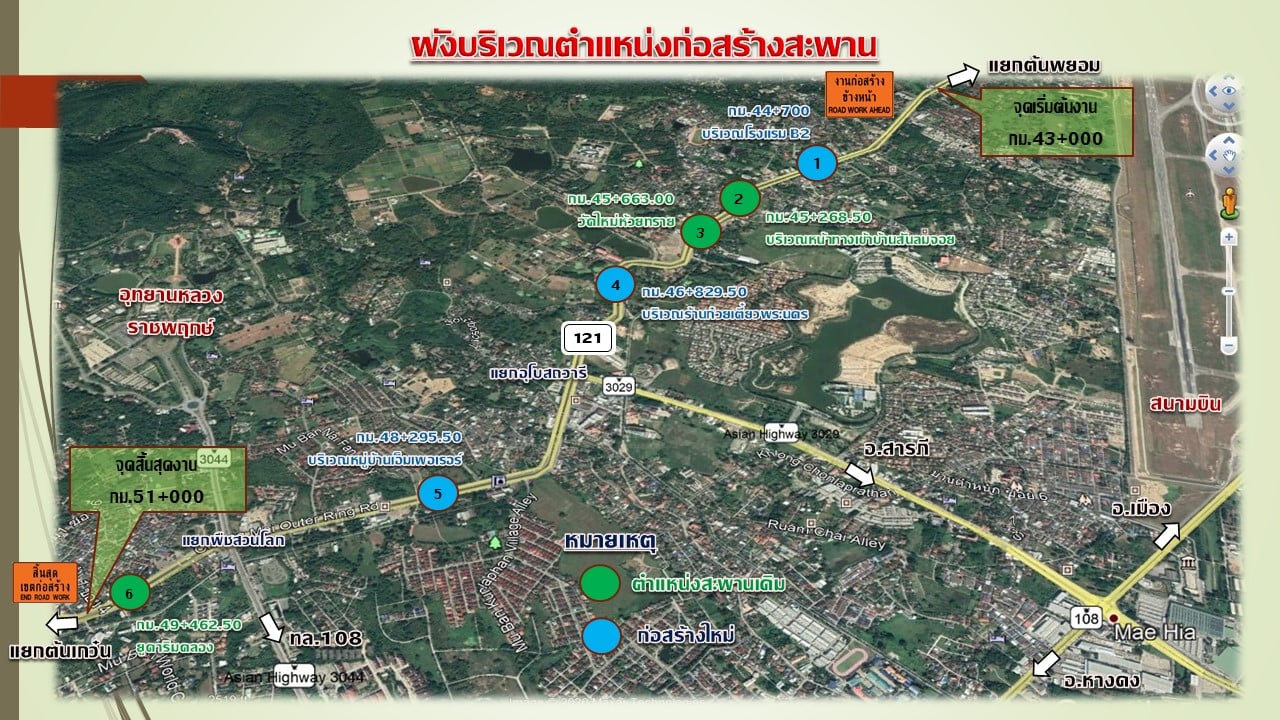 - รื้อสะพานเดิมและทำการก่อสร้างสะพานใหม่ จำนวน 6 แห่ง ดังนี้