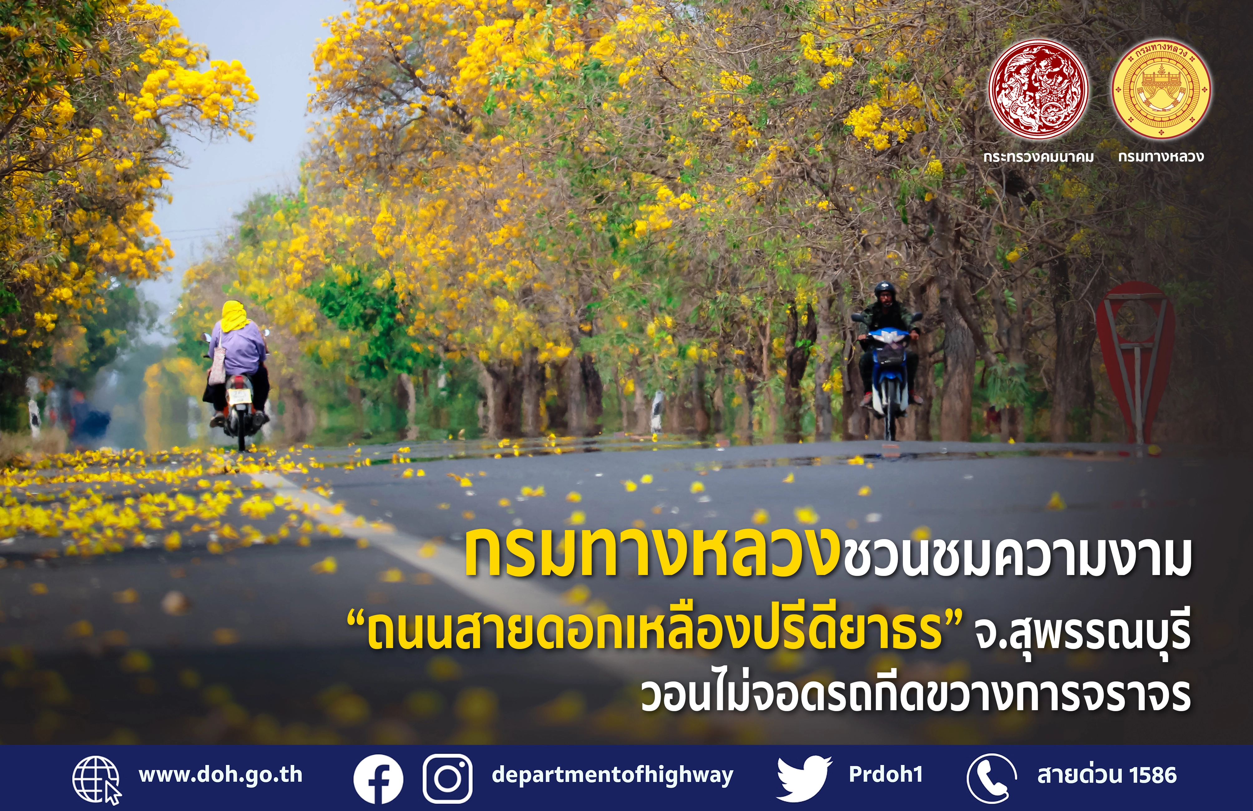 กรมทางหลวง โดย แขวงทางหลวงสุพรรณบุรีที่ 1 เชิญชวนผู้ใช้ทางชมความสวยงามของถนนสายดอกไม้ต้นเหลืองปรีดียาธรและต้นกัลปพฤกษ์ จังหวัดสุพรรณบุรี ที่บานพร้อมกันในช่วงฤดูร้อนของทุกปี เป็นแนวยาวหลายกิโลเมตร ซึ่งจะออกดอกให้ชื่นชมปีละครั้งเท่านั้น พร้อมทั้งดำเนินการเตรียมความพร้อมปรับปรุงทางหลวงให้สวยงาม ตามนโยบาย “คมนาคมสีสัน สร้างสรรค์ประเทศไทย” ของนายศักดิ์สยาม ชิดชอบ รัฐมนตรีว่าการกระทรวงคมนาคม ที่ได้สั่งการให้กรมทางหลวงเตรียมความพร้อมในทุกด้าน โดยเฉพาะเรื่องการอำนวยความสะดวกในการเดินทาง และปรับปรุงทัศนียภาพทางหลวง ให้มีความสวยงาม