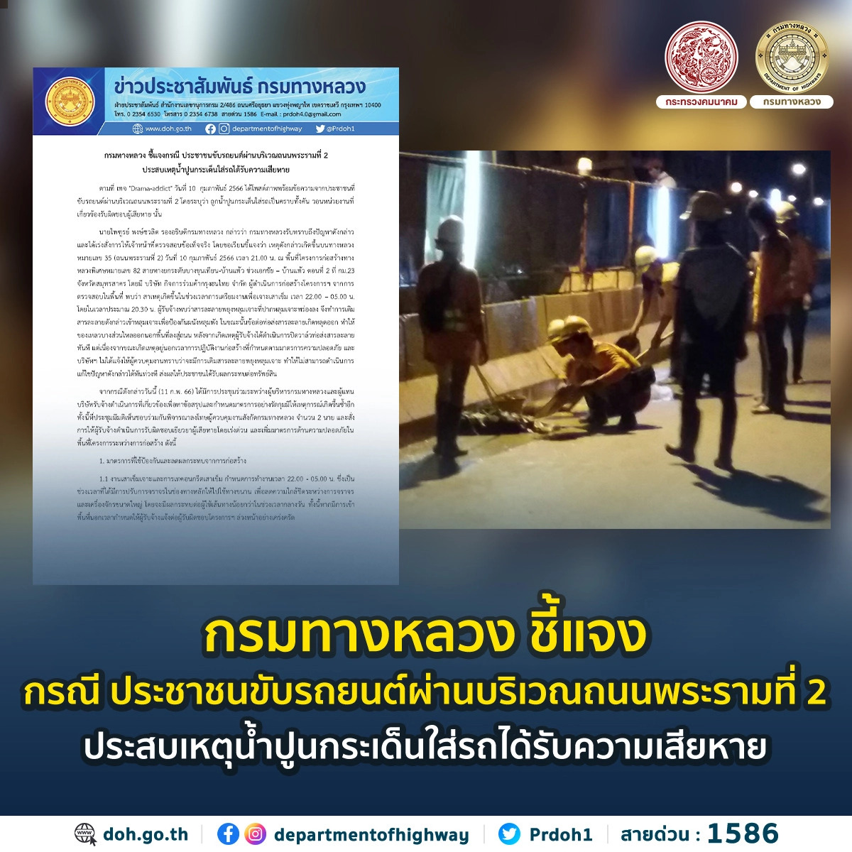 ตามที่ เพจ "Drama-addict" วันที่ 10 กุมภาพันธ์ 2566 ได้โพสต์ภาพพร้อมข้อความจากประชาชนที่ขับรถยนต์ผ่านบริเวณถนนพระรามที่ 2 โดยระบุว่า ถูกน้ำปูนกระเด็นใส่รถเป็นคราบทั้งคัน วอนหน่วยงานที่เกี่ยวข้องรับผิดชอบผู้เสียหาย นั้น