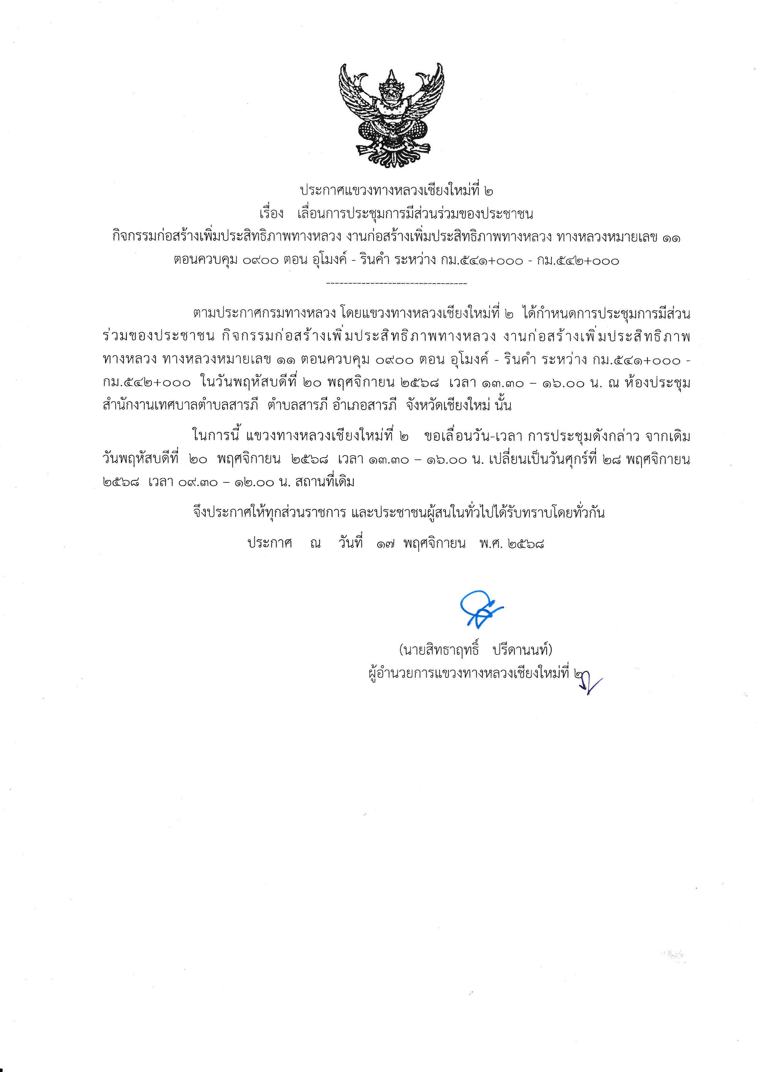 ในการนี้ แขวงทางหลวงเชียงใหม่ที่ 2 ขอเลื่อนวัน-เวลา การประชุมดังกล่าว จากเดิมวันพฤหัสบดีที่ 20 พฤศจิกายน 2568 เวลา 13.30 – 16.00 น. เปลี่ยนเป็นวันศุกร์ที่ 28 พฤศจิกายน 2568 เวลา 09.30 – 12.00 น. สถานที่เดิม